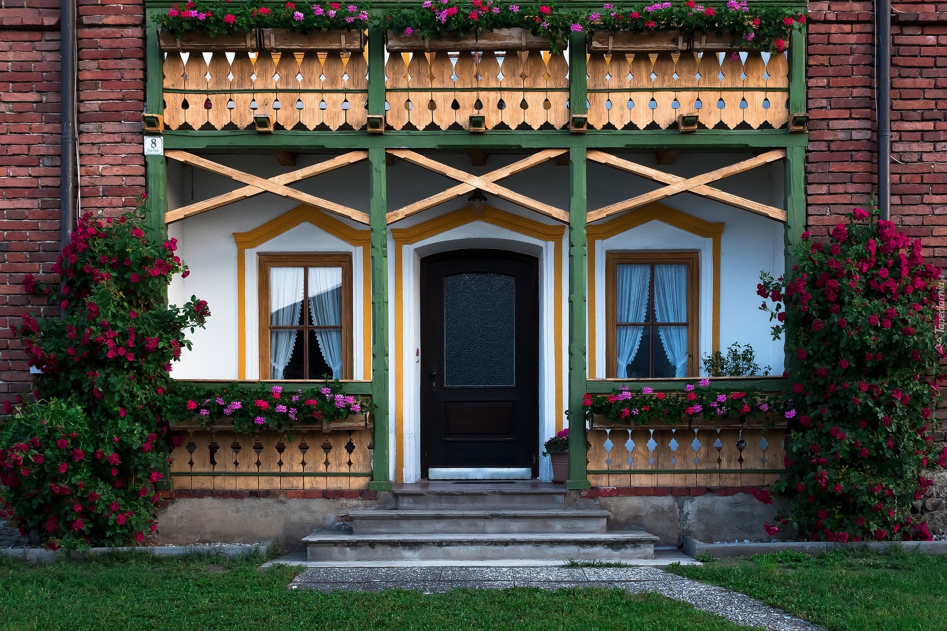 Edytor tapety: Weranda przy wejściu do domu ozdobiona kwiatami
