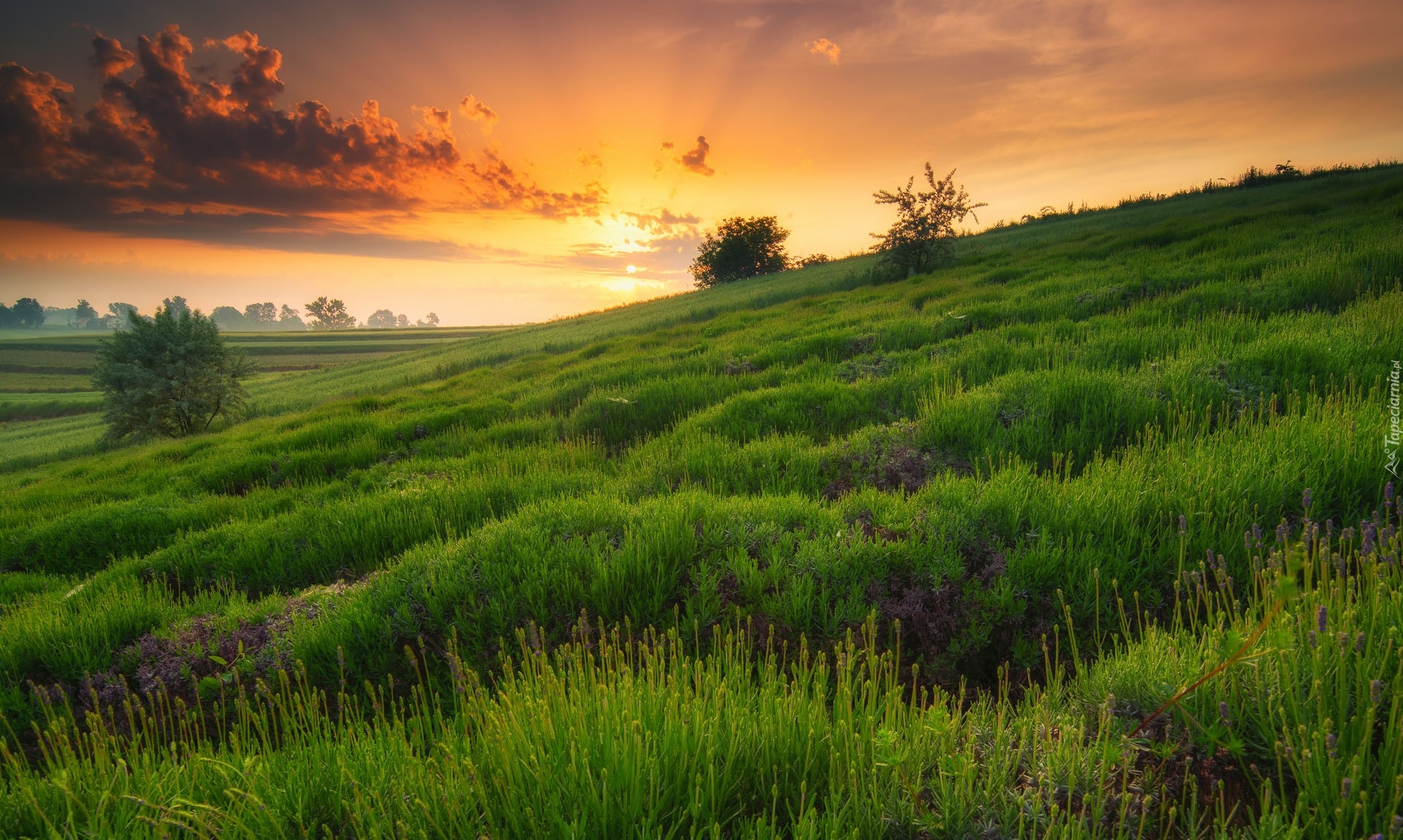 Edytor tapety: Łąka na wzgórzu w blasku zachodzącego słońca