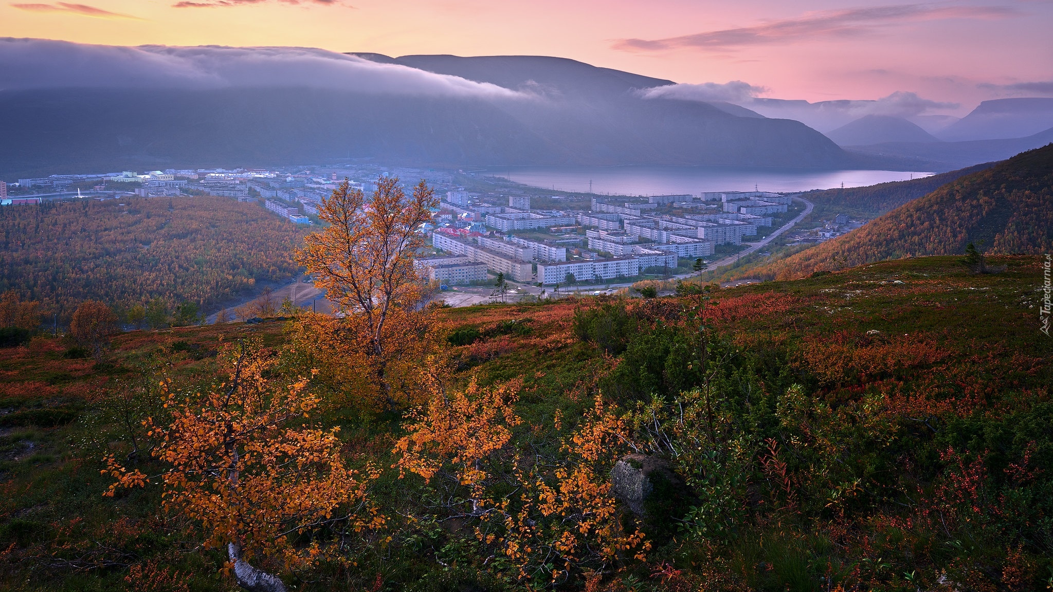 Edytor tapety: Widok ze wzgórza na zamglone miasteczko