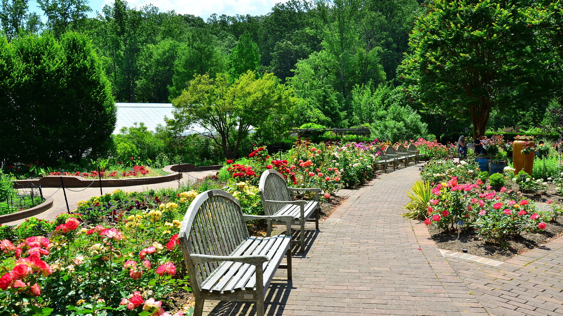 Edytor tapety: Ławki obok krzewów róż przy ścieżce w parku