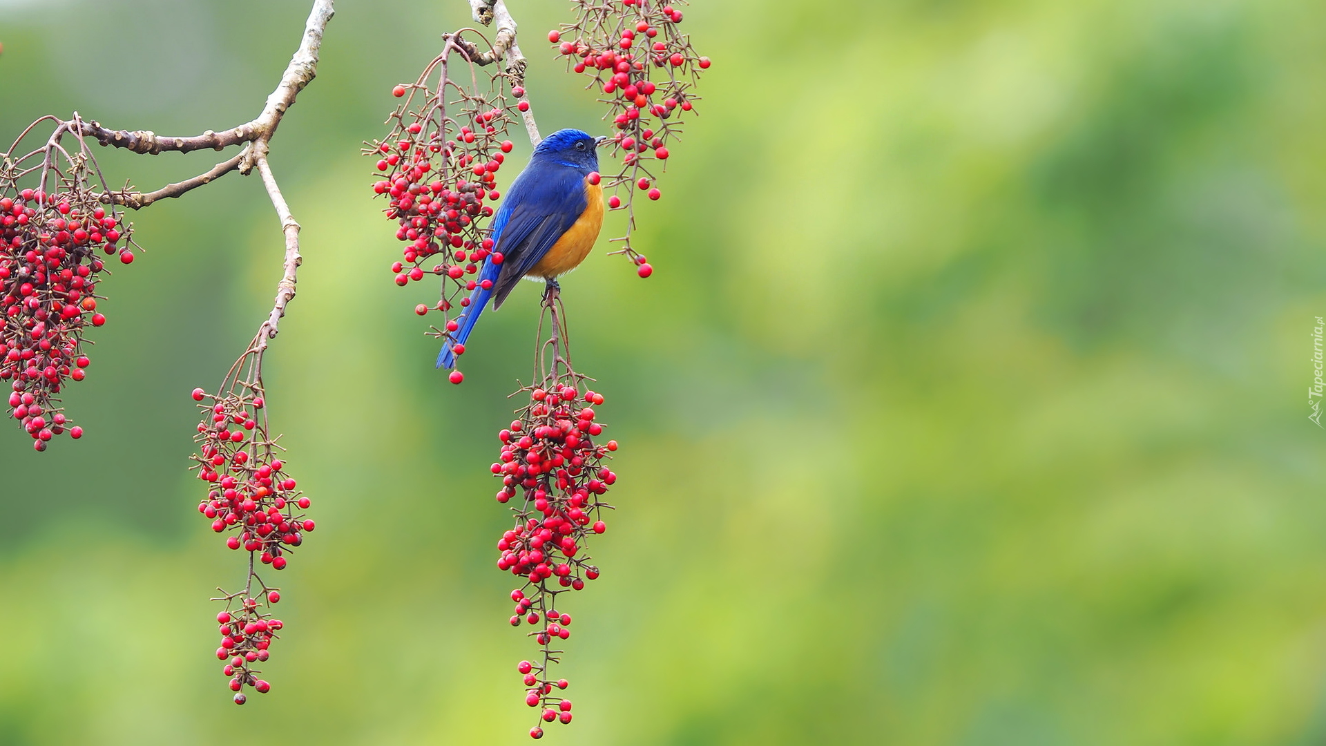 Edytor tapety: Niltawa ognista na gałązce z czerwonymi owocami