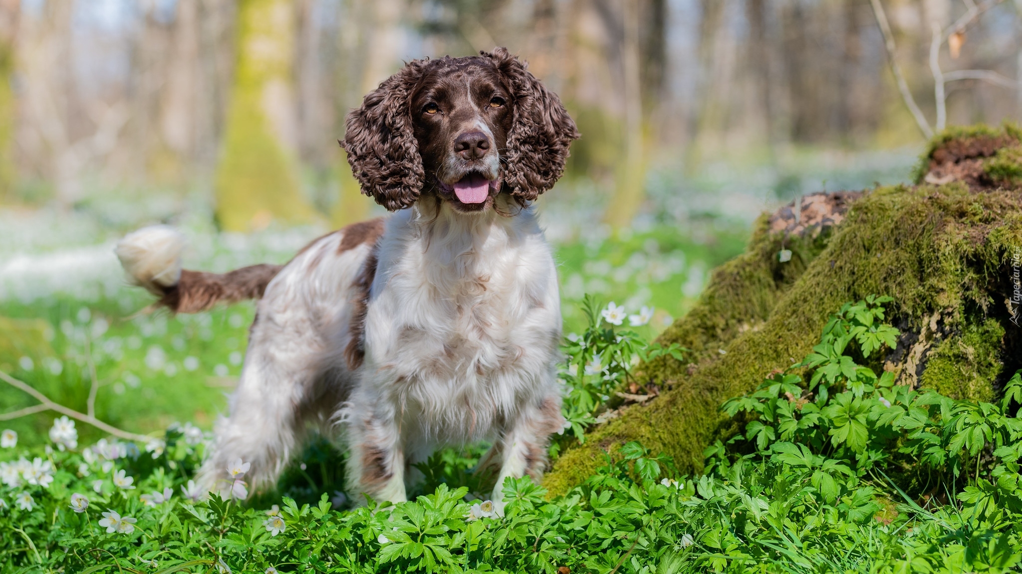 Edytor tapety: Springer spaniel angielski obok omszałego pnia