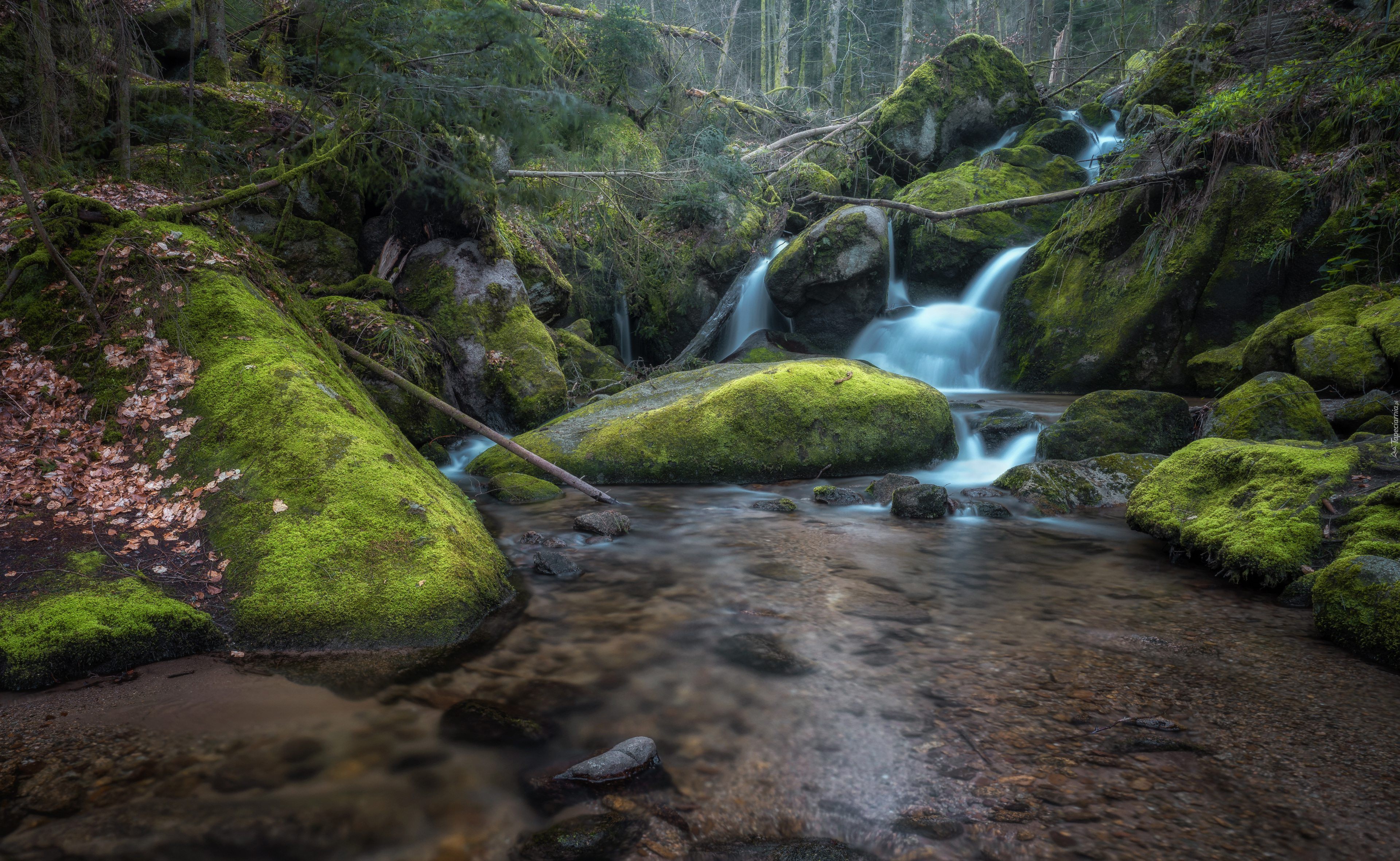 Edytor tapety: Połamane konary i omszałe kamienie w leśnym potoku