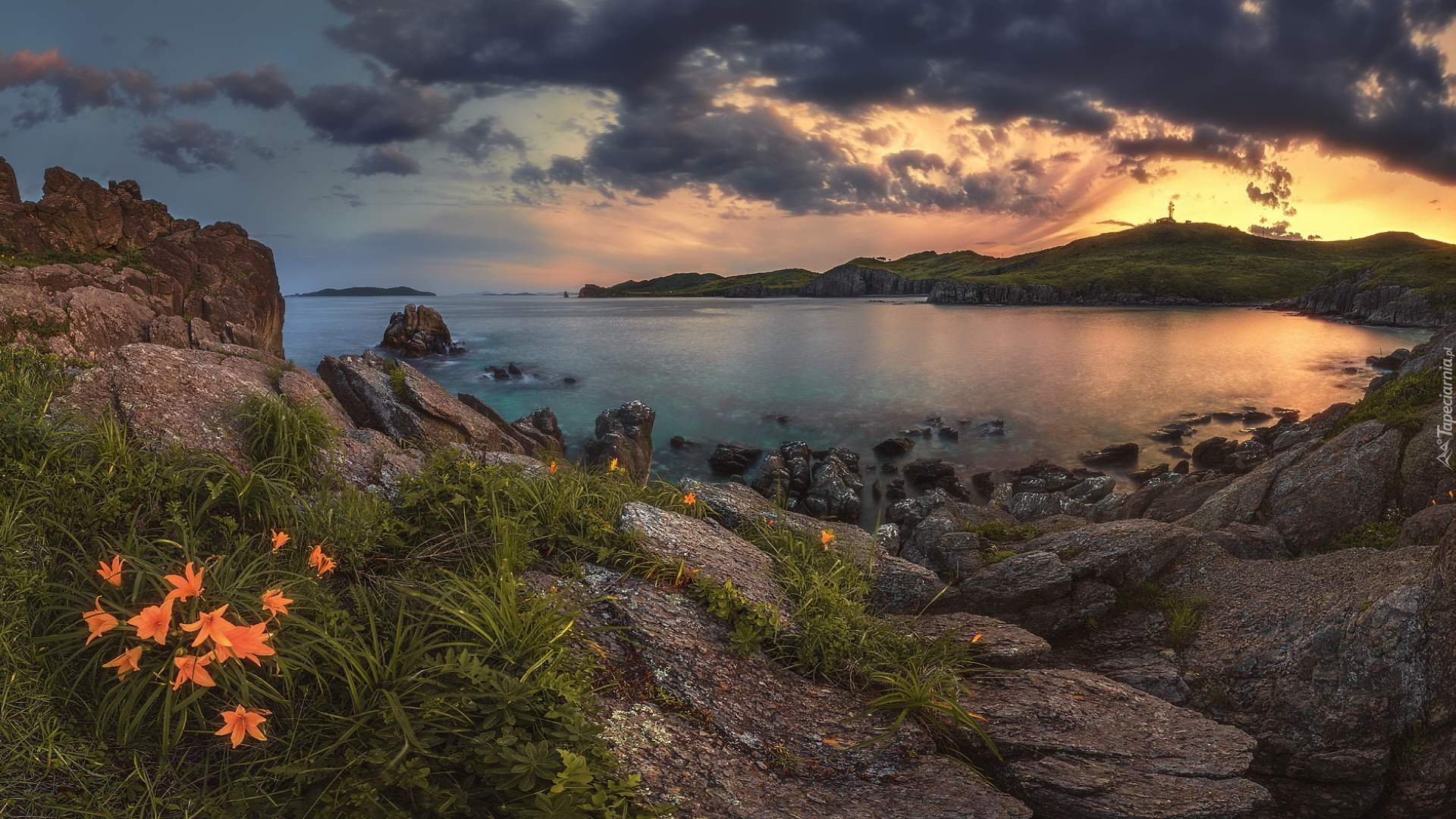 Edytor tapety: Pomarańczowe lilie na skałach i widok na zatokę