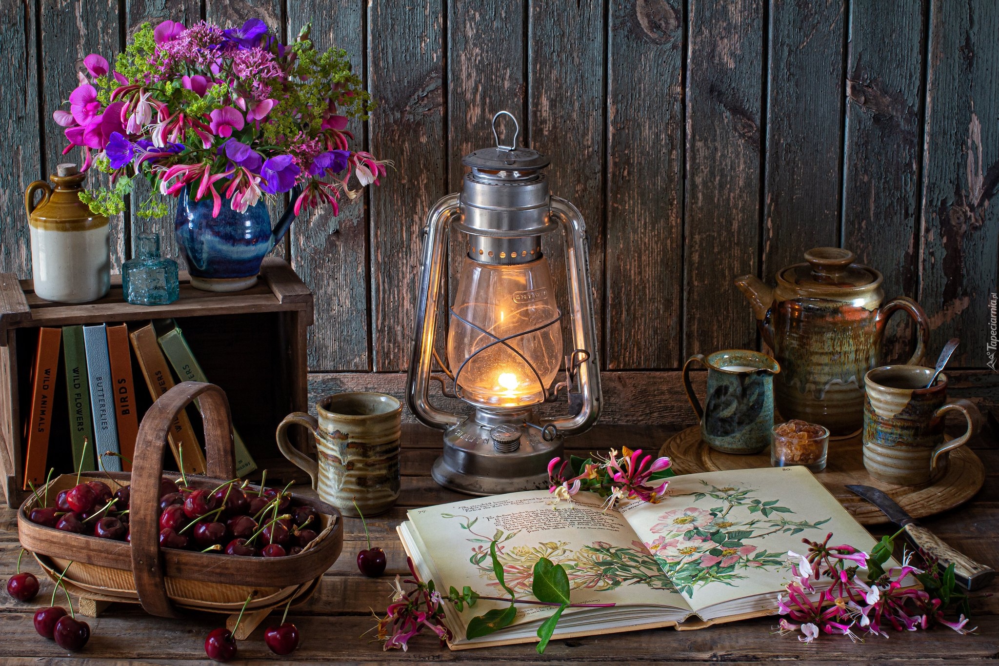 Edytor tapety: Koszyk czereśni obok książki i lampy naftowej