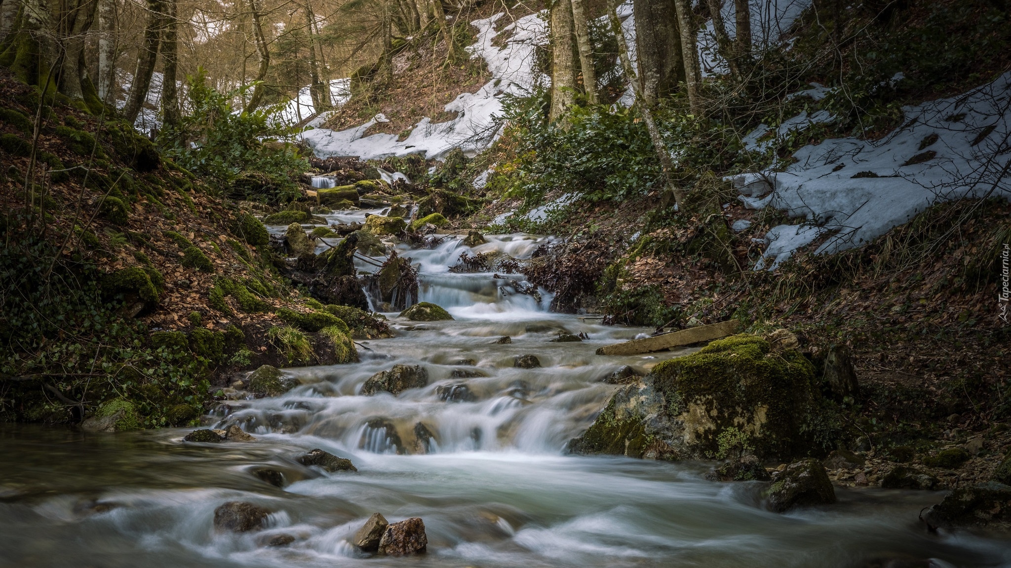 Edytor tapety: Śnieg pod drzewami przy leśnej rzece