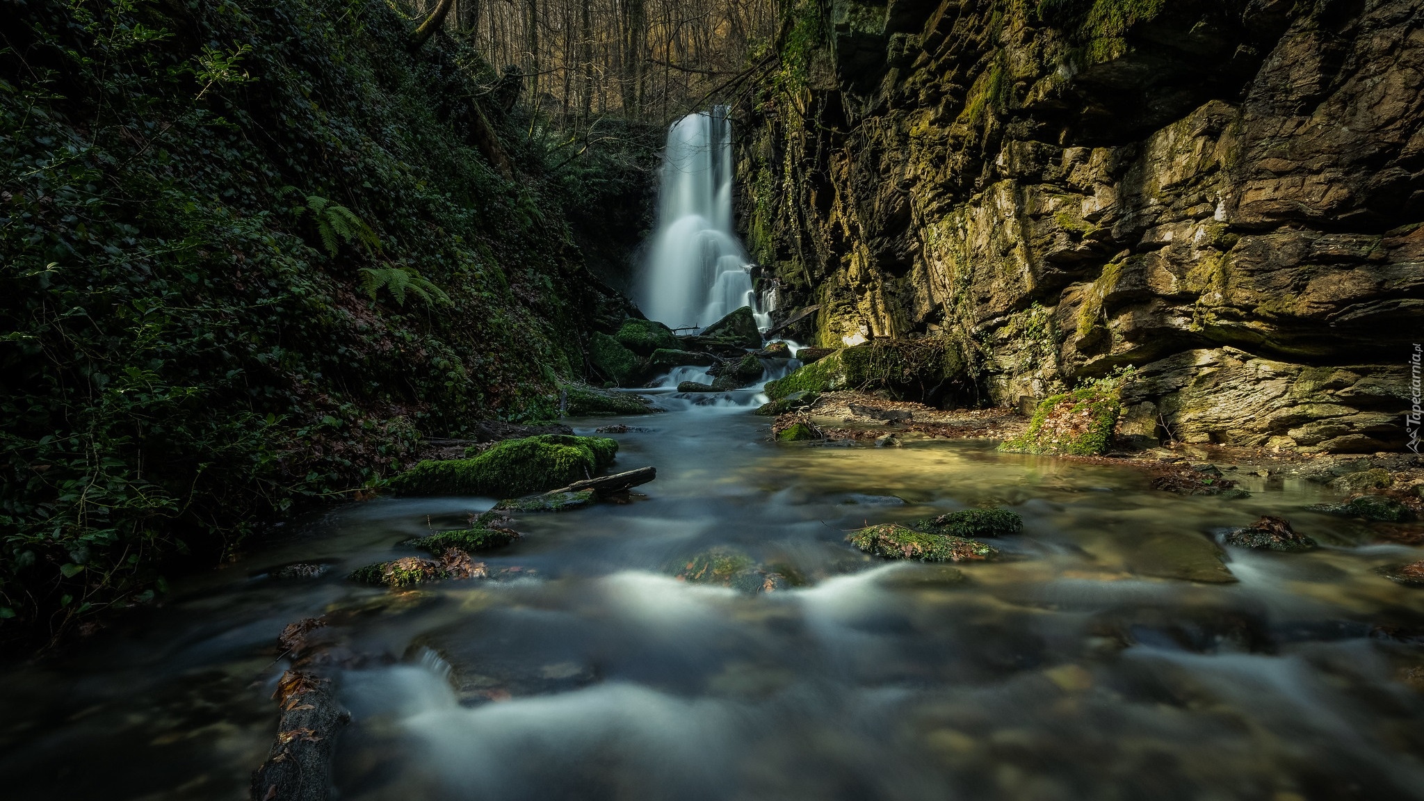 Edytor tapety: Rozświetlone skały przy leśnym wodospadzie