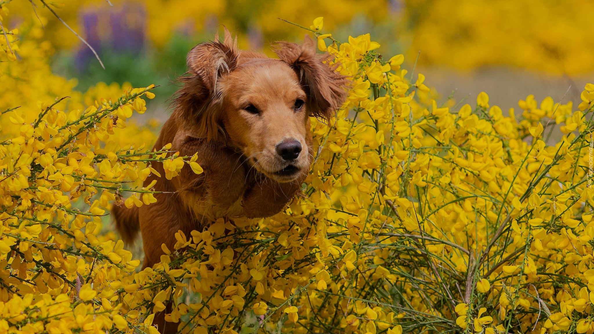 Edytor tapety: Brązowy pies pośród żółtych kwiatów