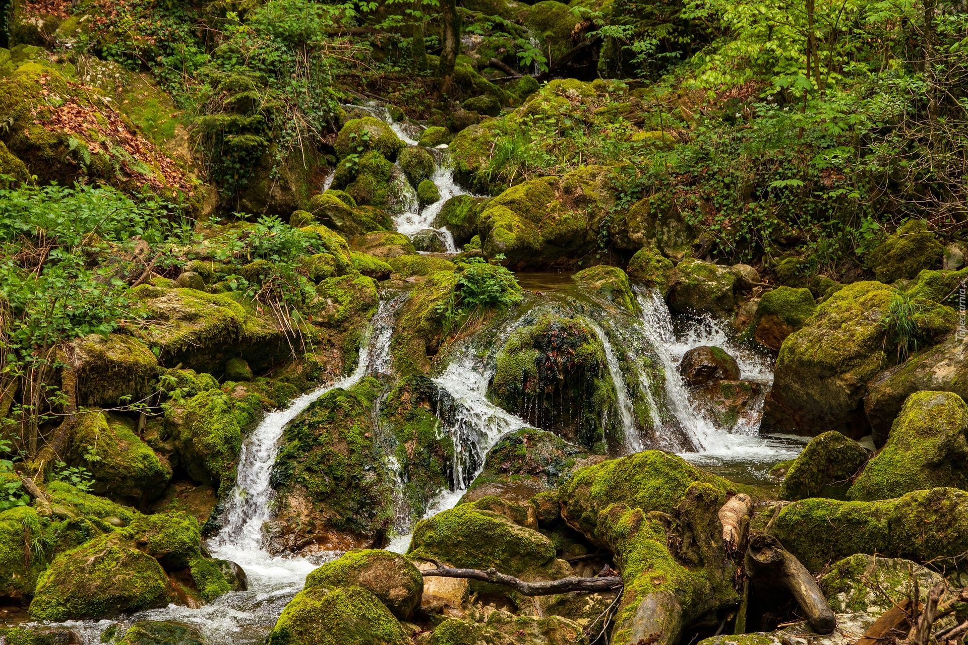 Edytor tapety: Górski potok wśród omszałych głazów i roślinności