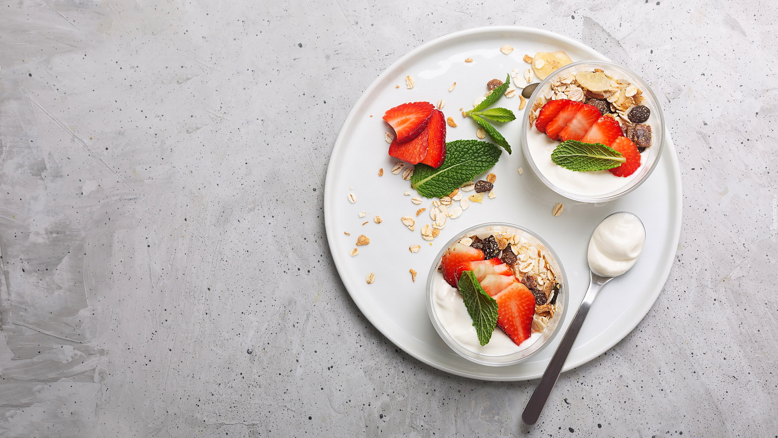 Edytor tapety: Deser jogurtowy z musli i truskawkami