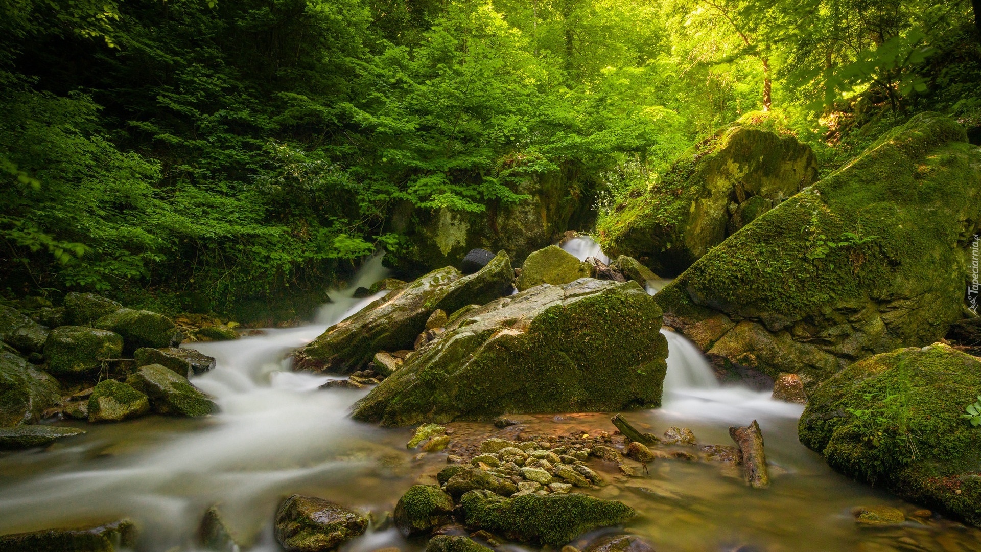 Edytor tapety: Omszałe głazy i drzewa przy leśnej rzece