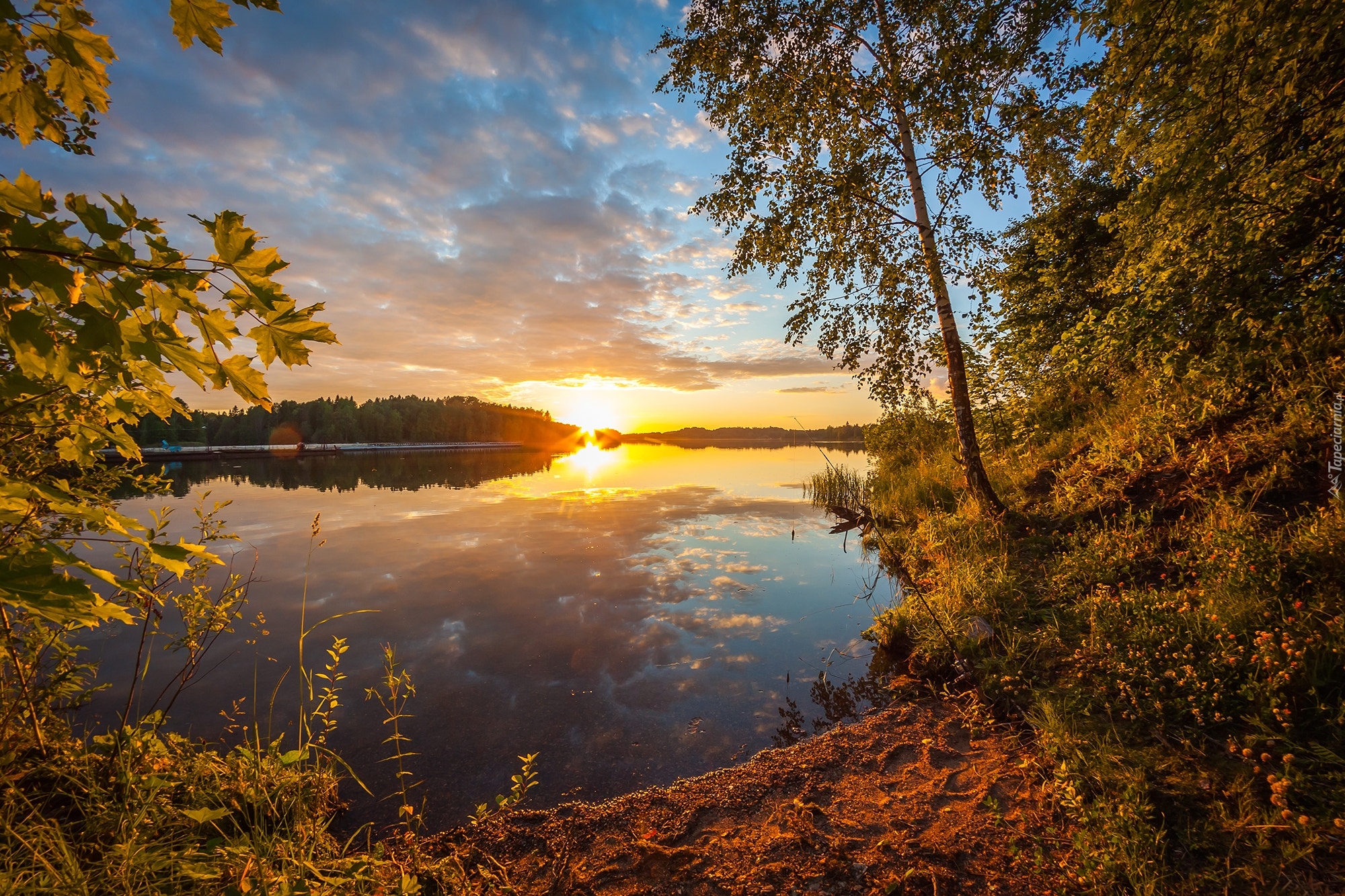 Edytor tapety: Brzoza nad jeziorem w blasku zachodzącego słońca