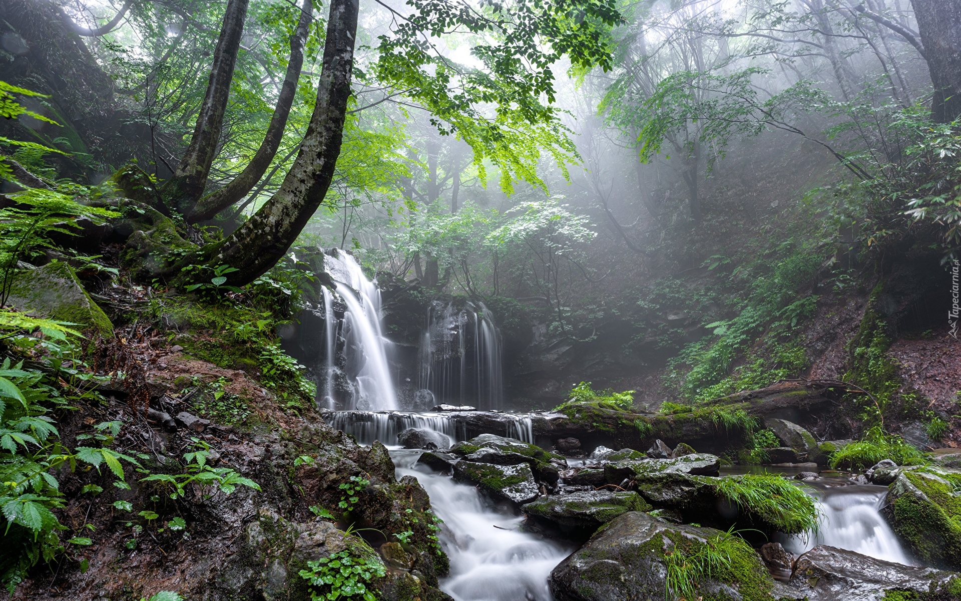 Edytor tapety: Kamienista rzeka z wodospadem w lesie