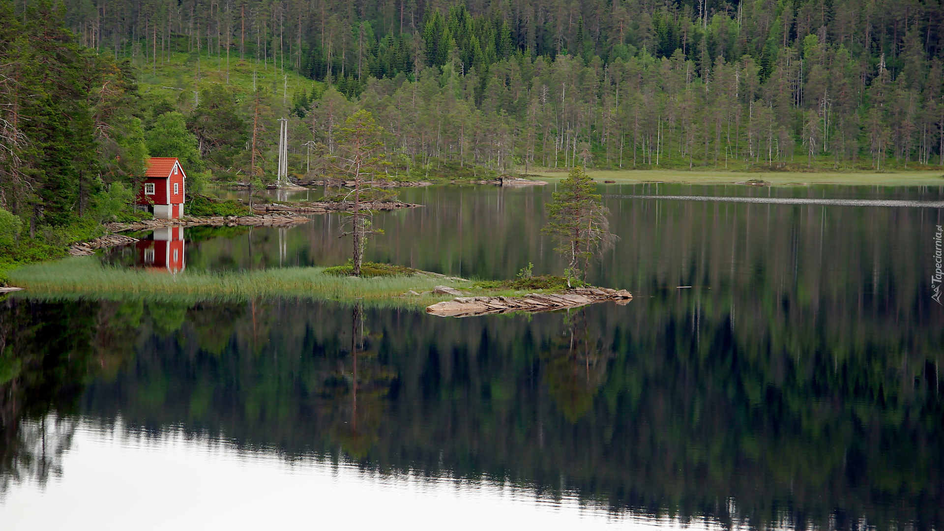 Edytor tapety: Czerwony domek pod drzewami nad jeziorem