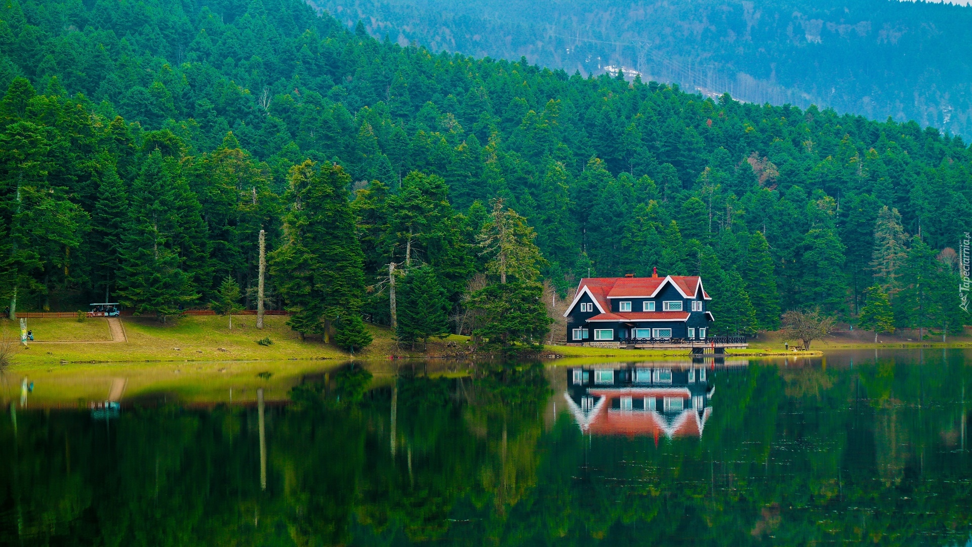 Edytor tapety: Dom pod lasem nad jeziorem Golcuk w Turcji