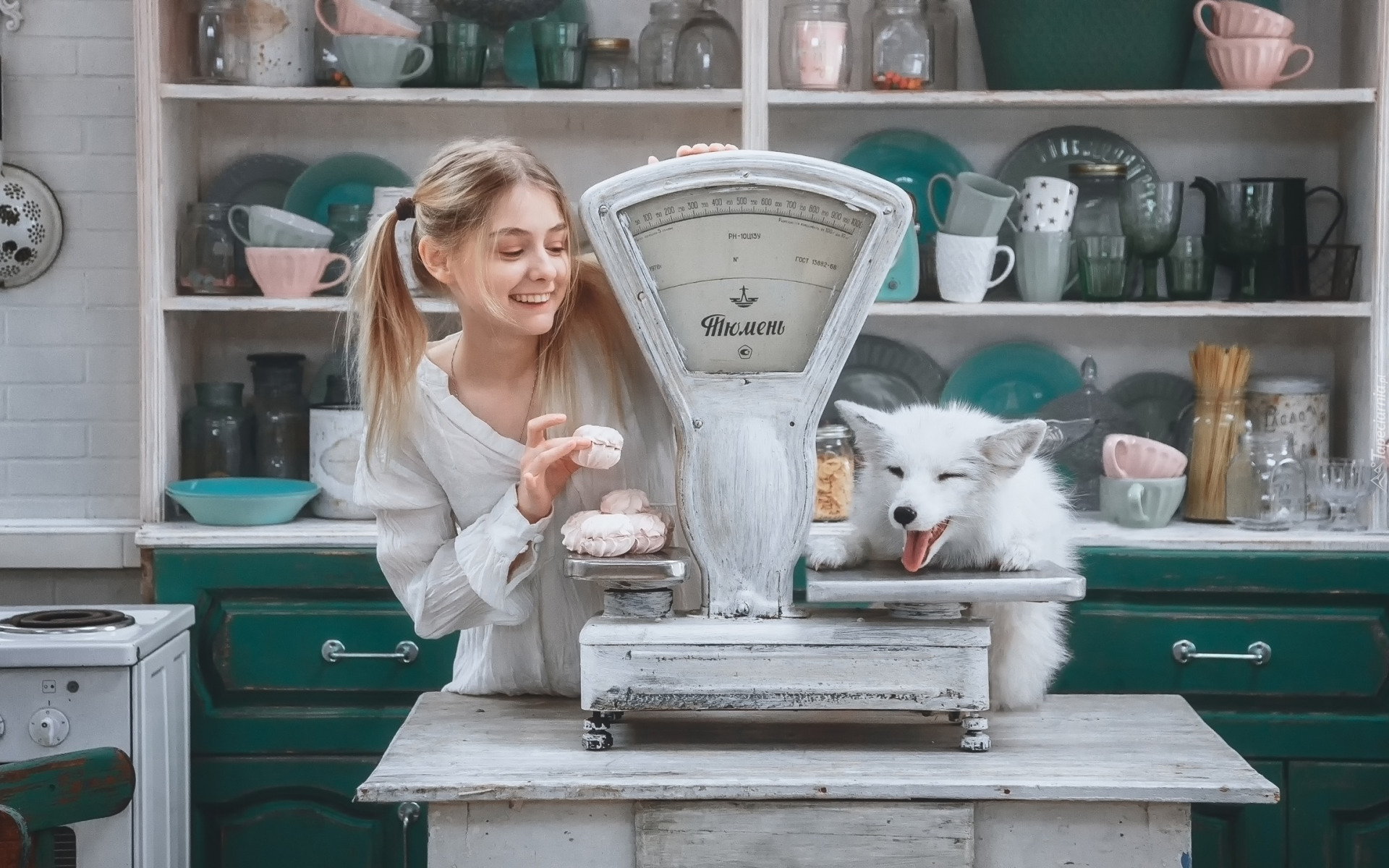 Edytor tapety: Dziewczynka z białym lisem obok wagi sklepowej