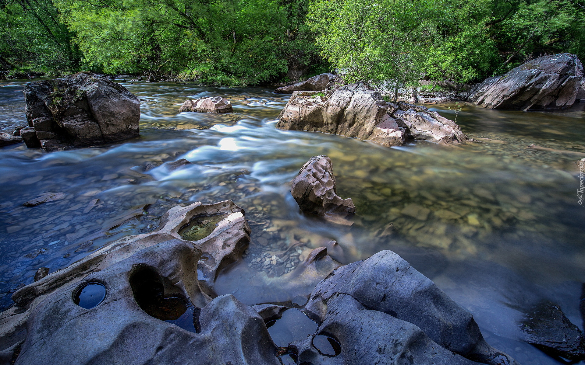 Edytor tapety: Zielone drzewa nad kamienistą rzeką