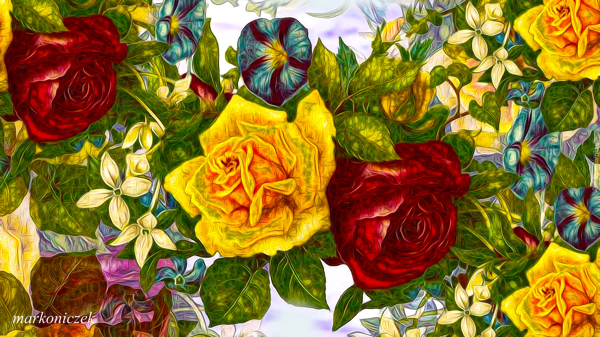 Edytor tapety: Czerwone i żółte róże obok innych kwiatów