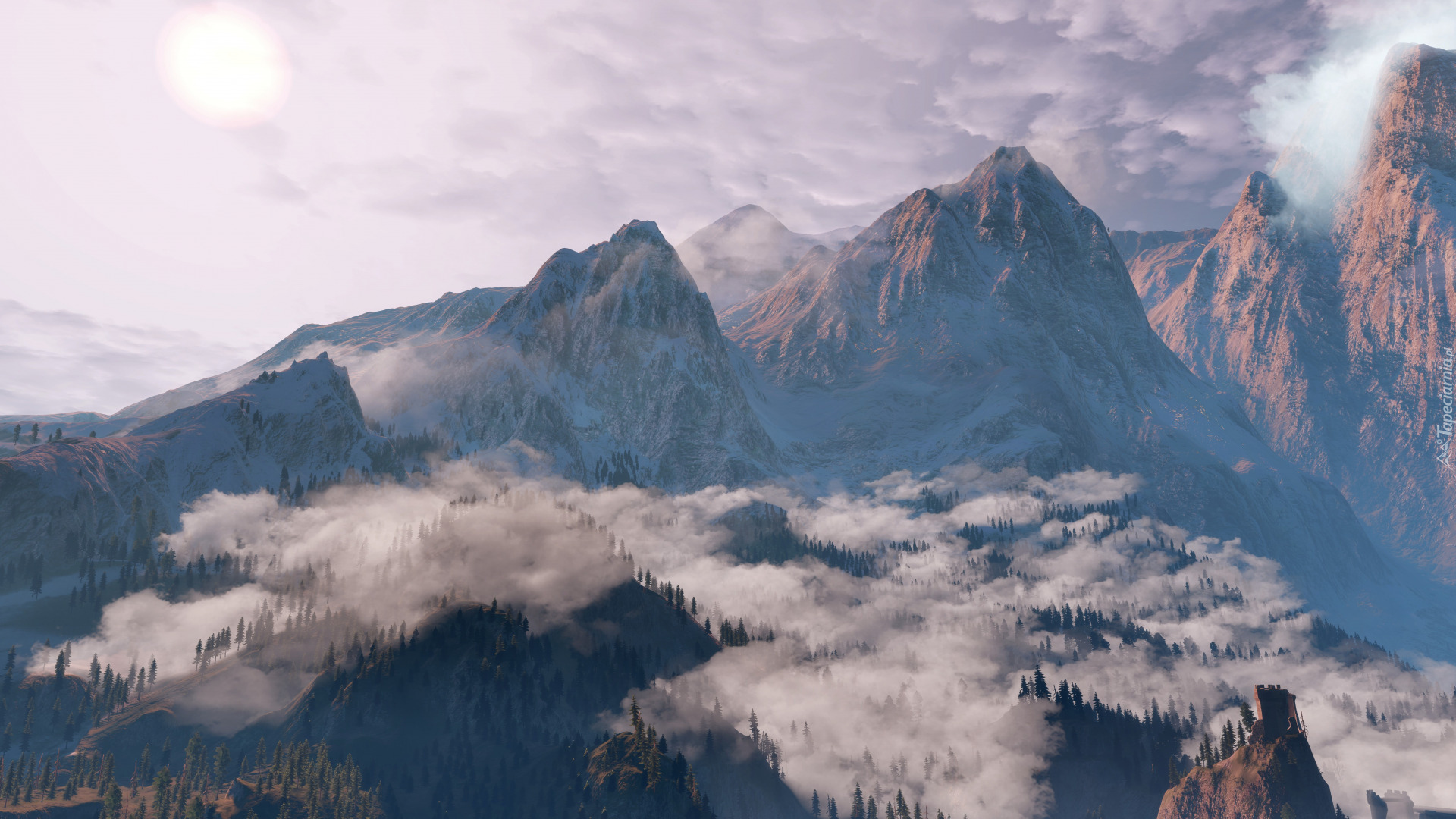 Edytor tapety: Zamglone lasy na tle gór w grafice