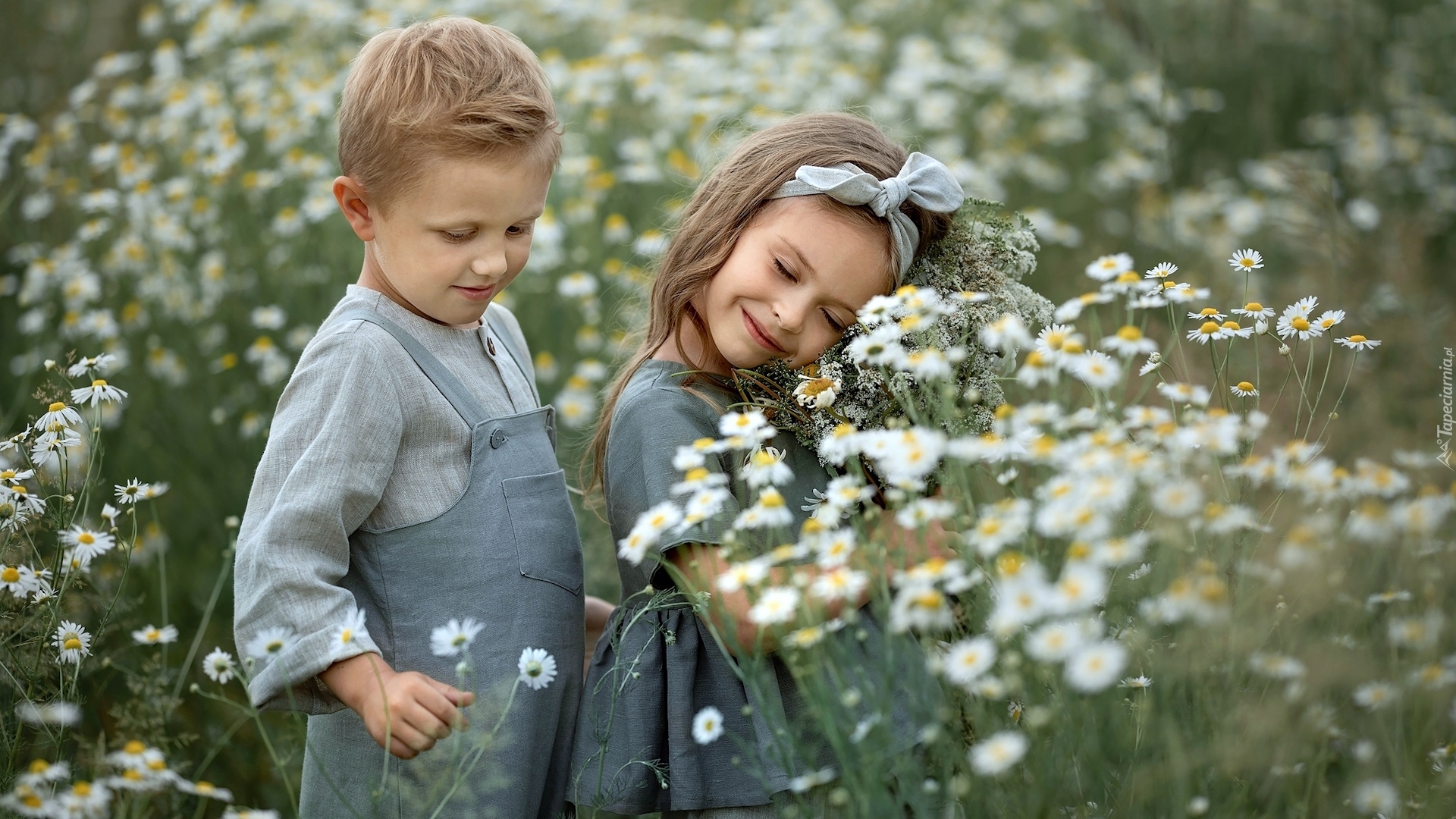Edytor tapety: Chłopiec i dziewczynka pośród rumianów