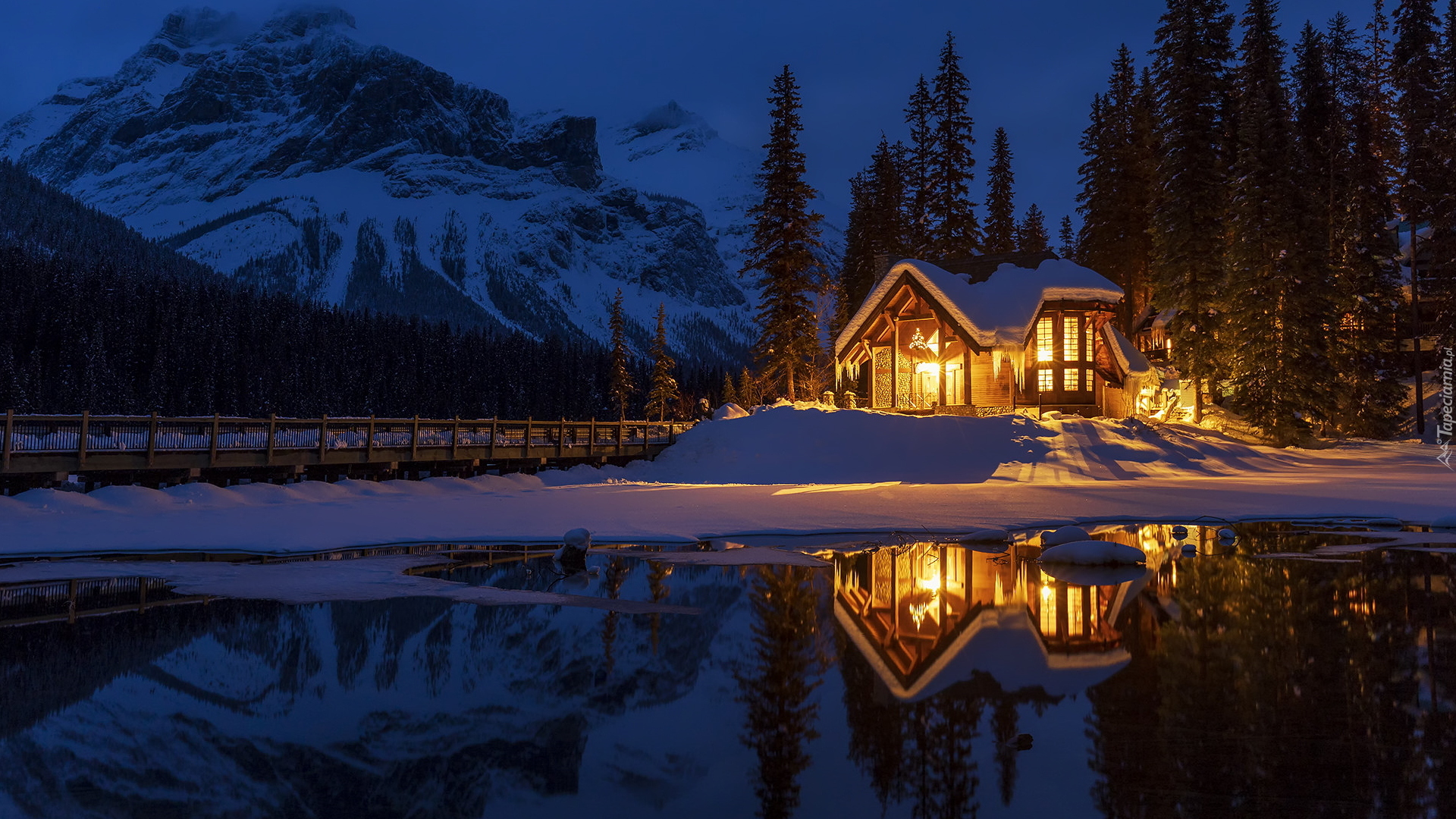 Edytor tapety: Oświetlony dom nad jeziorem Emerald Lake