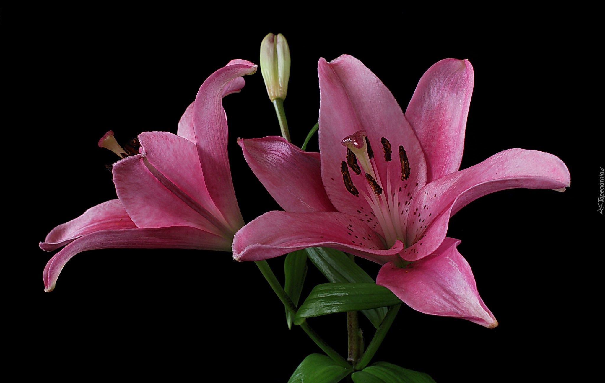 Edytor tapety: Różowe lilie i pąk na czarnym tle