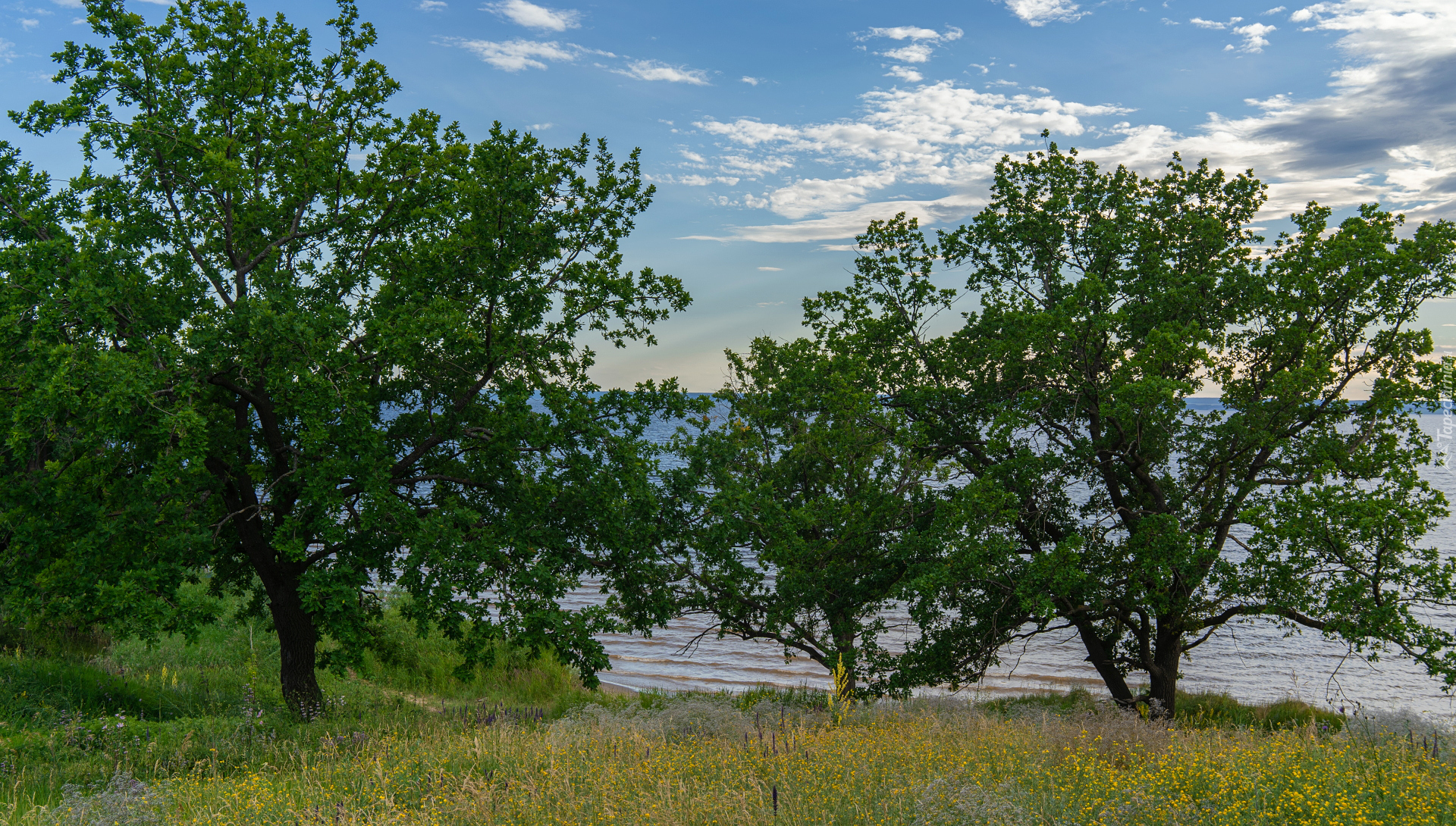 Edytor tapety: Drzewa na ukwieconej łące nad jeziorem