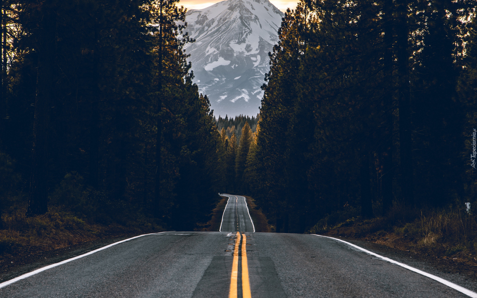 Edytor tapety: Asfaltowa droga w lesie i góra w tle