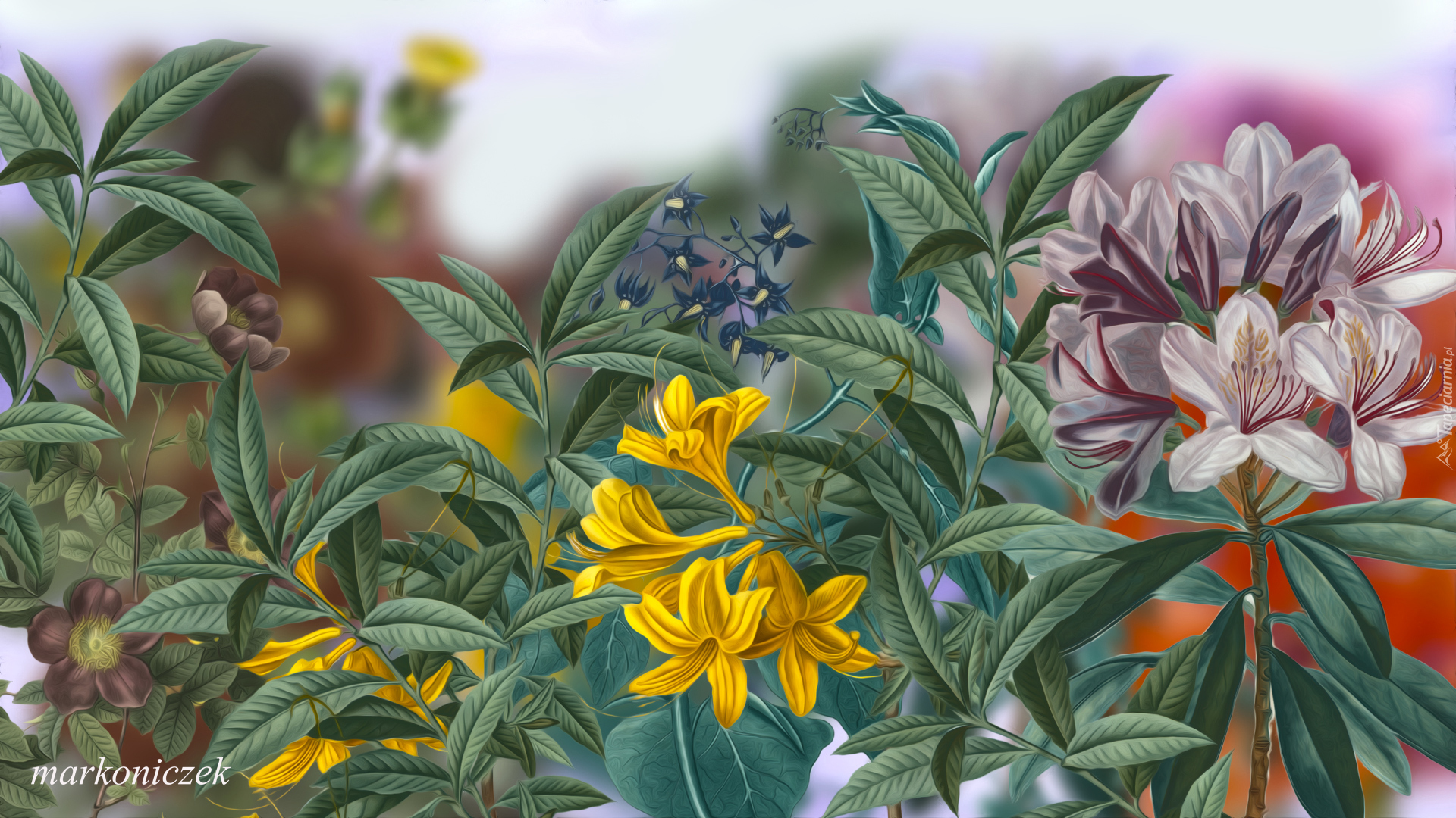 Edytor tapety: Kwiaty i liście na rozmytym tle w grafice
