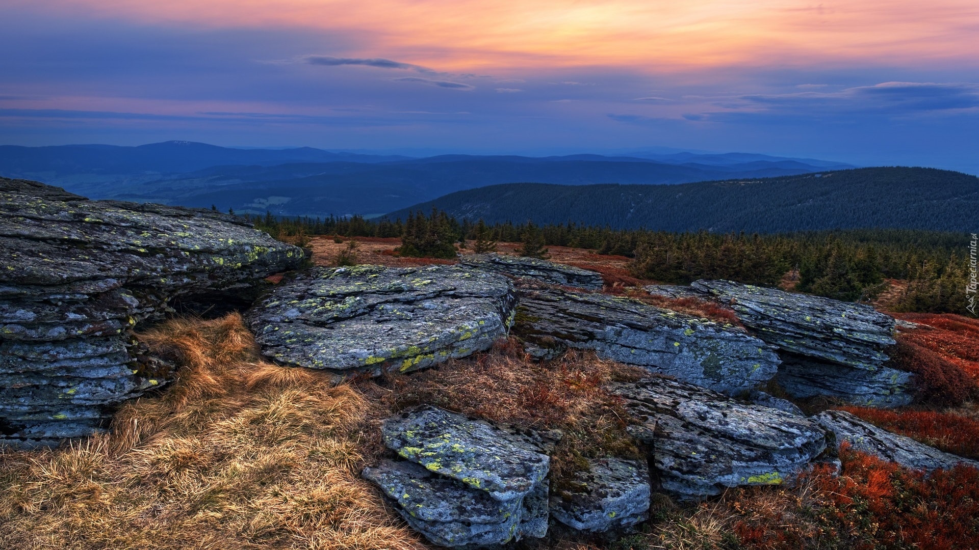 Edytor tapety: Pożółkła trawa wśród skał na tle panoramy gór