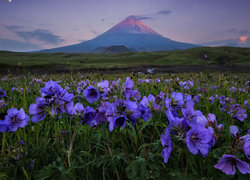 Edytor tapety: Widok z łąki pokrytej niebieskimi kwiatami na wulkan Kluczewska Sopka