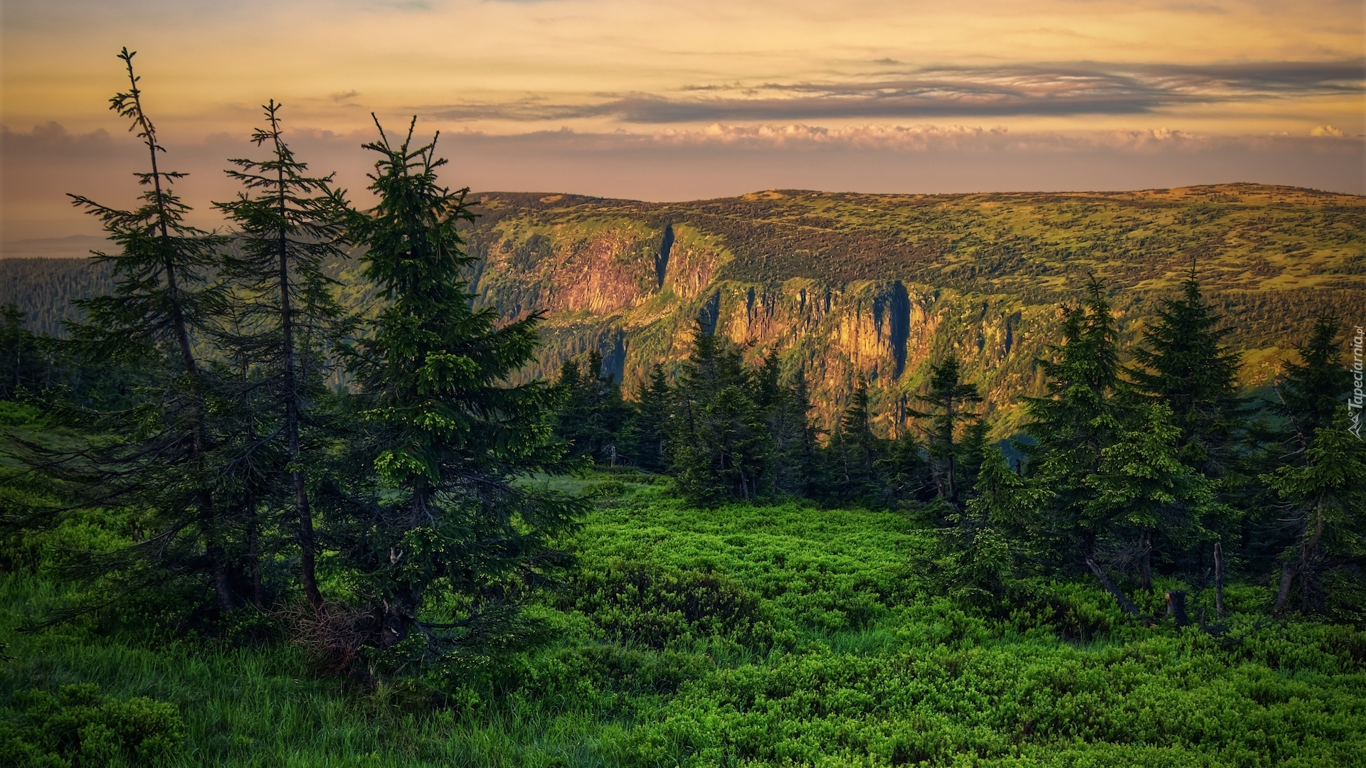 Edytor tapety: Świerki na tle rozświetlonych Karkonoszy