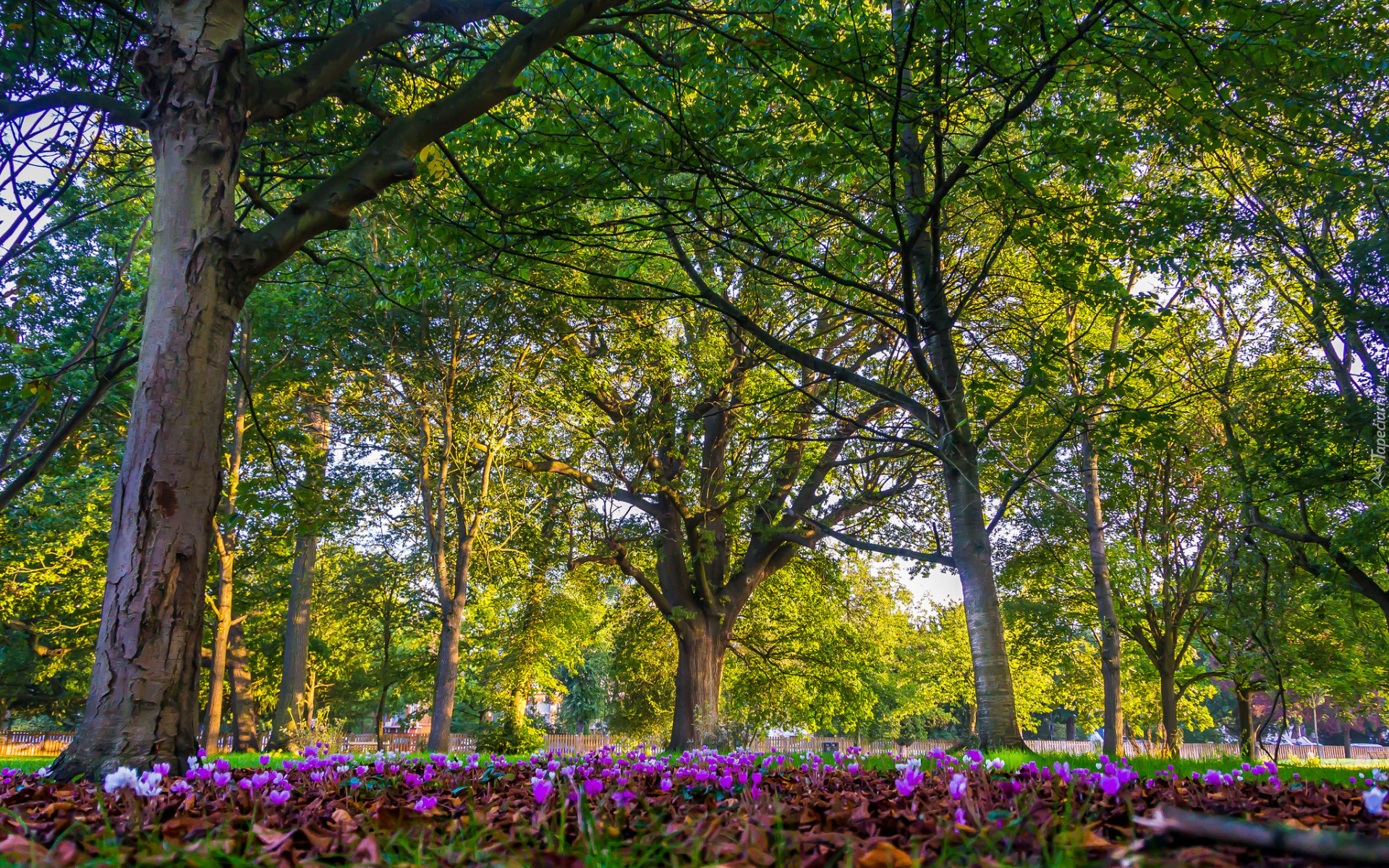 Edytor tapety: Kwiaty pod zielonymi drzewami