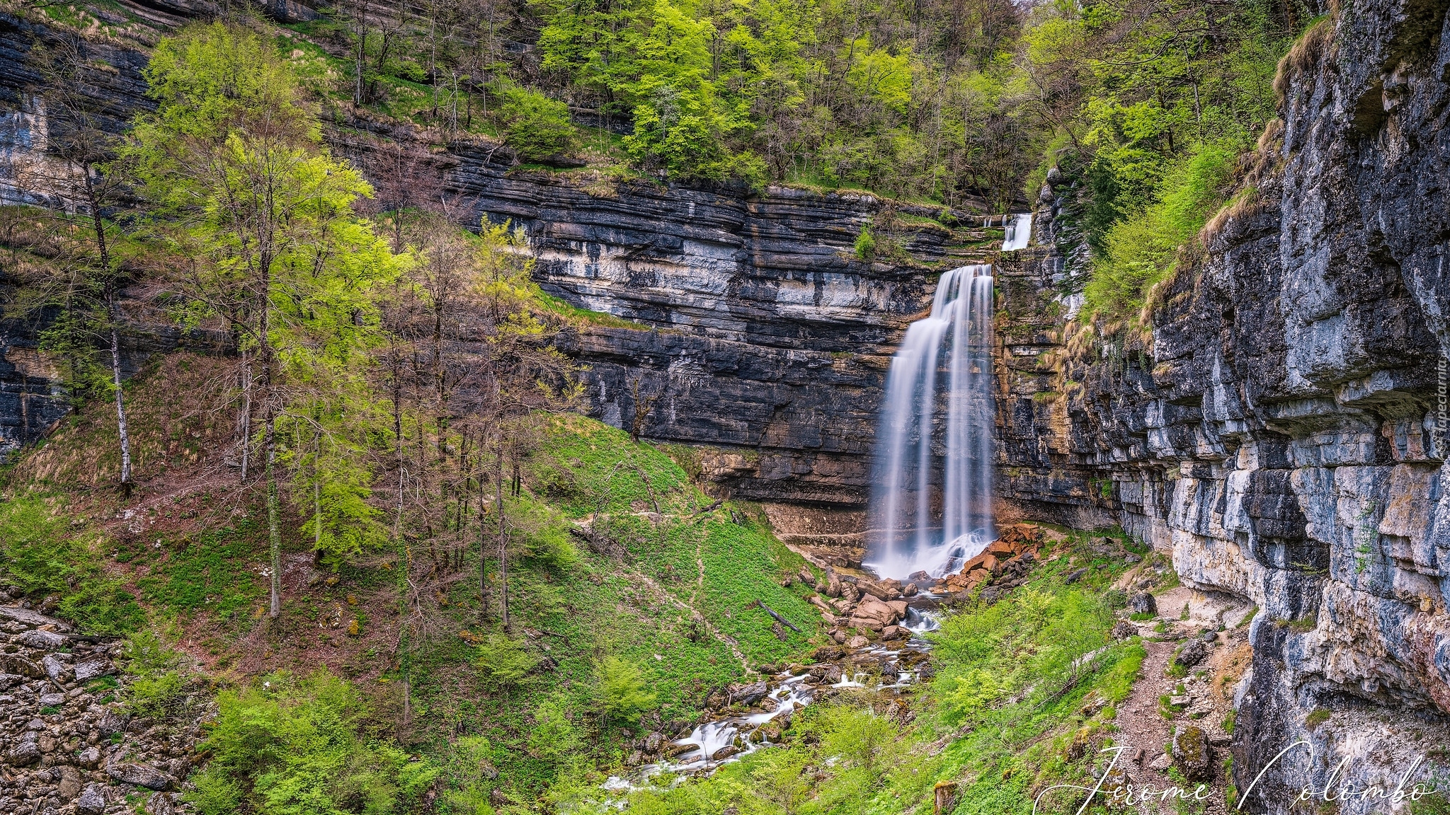 Edytor tapety: Wodospad Herisson pośród skał i zielonych drzew