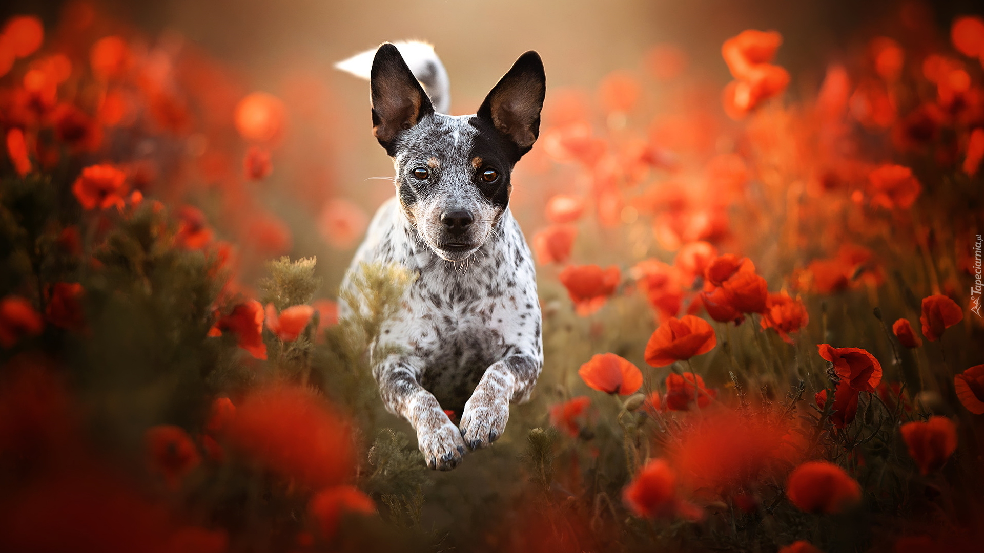 Edytor tapety: Biało-czarny pies pośród maków