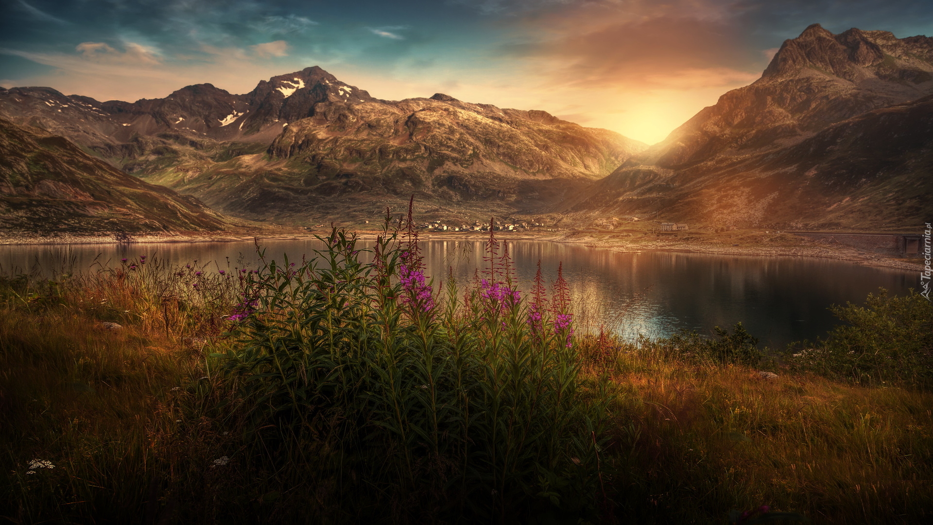 Edytor tapety: Kwiaty nad jeziorem i góry w tle