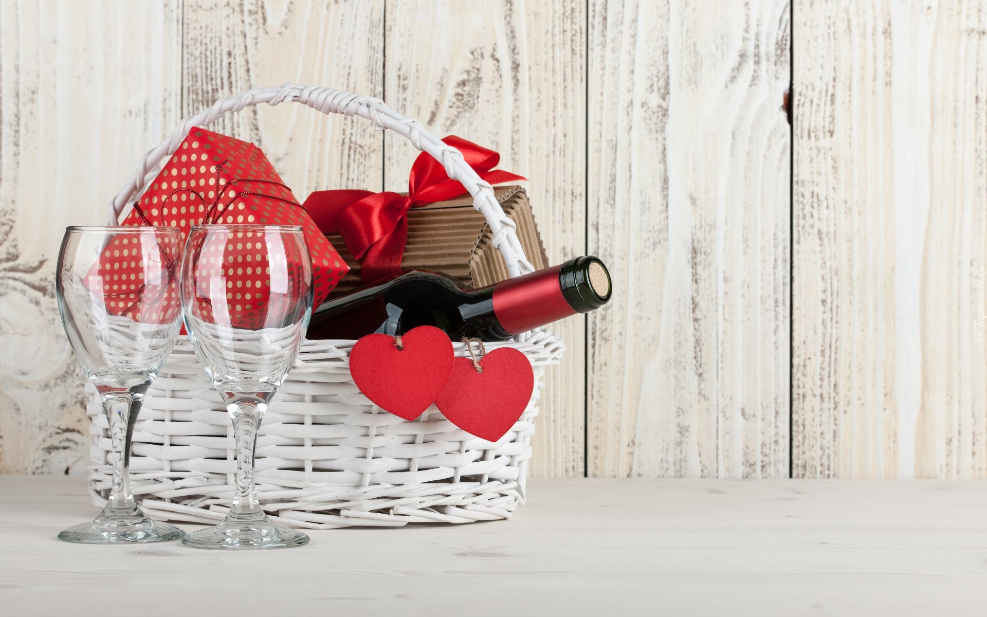 Edytor tapety: Kieliszki obok kosza z prezentami i winem