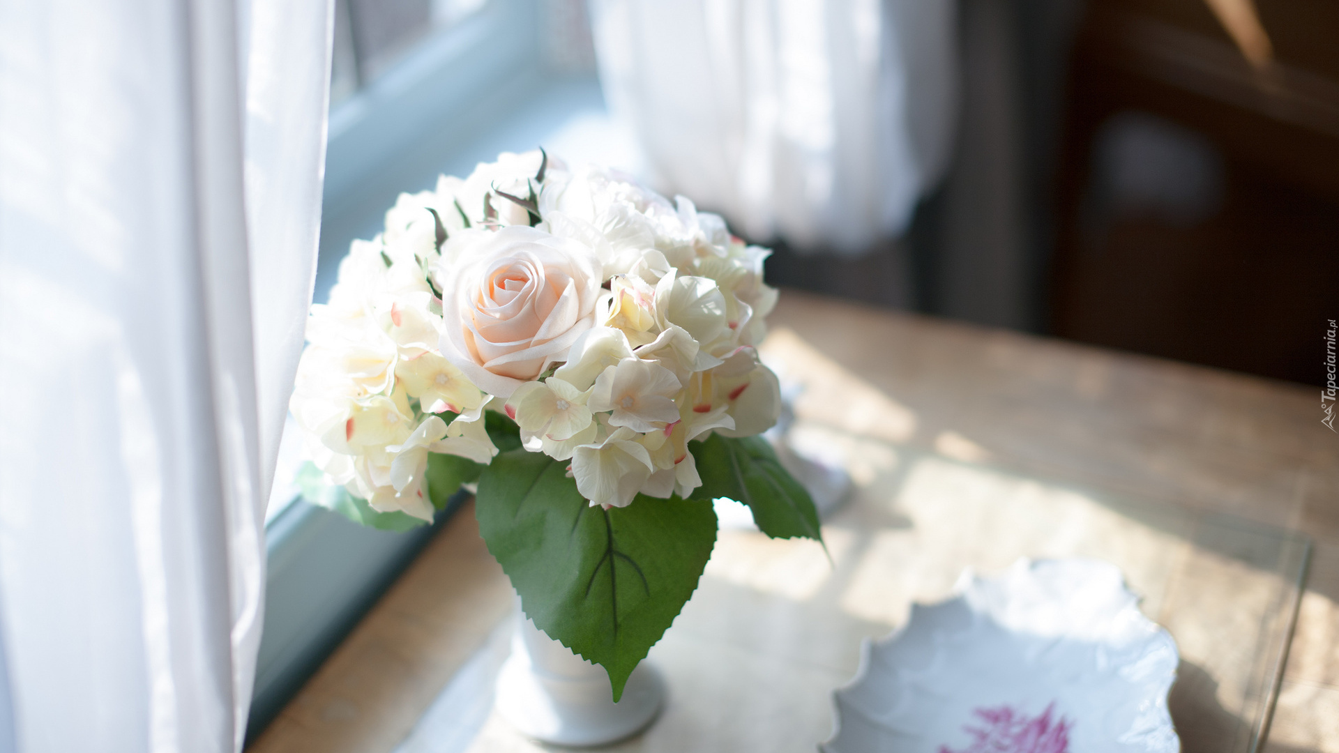 Edytor tapety: Róża i hortensja w wazonie przy oknie