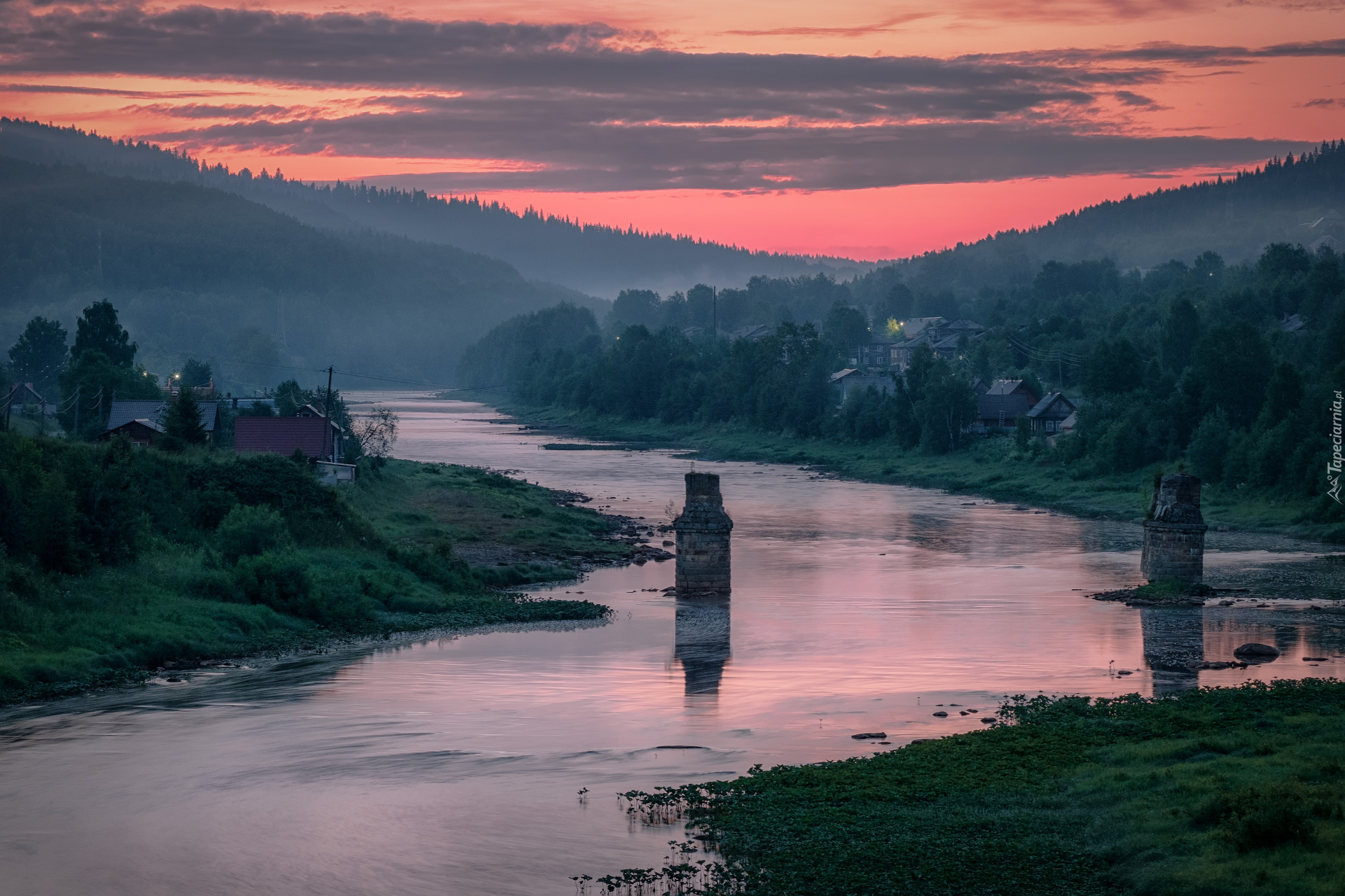 Edytor tapety: Domy pośród drzew nad rzeką