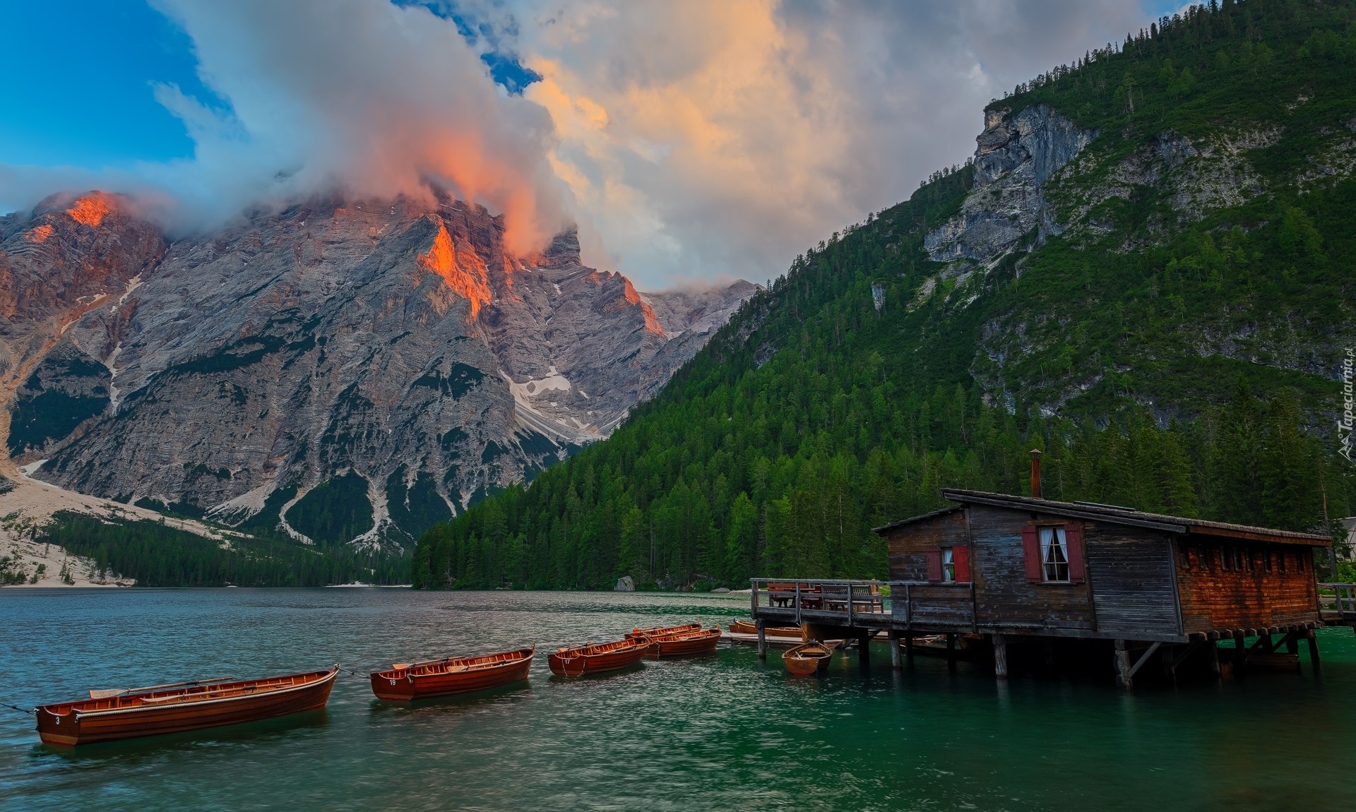 Edytor tapety: Łódki i drewniany domek na jeziorze Pragser Wildsee