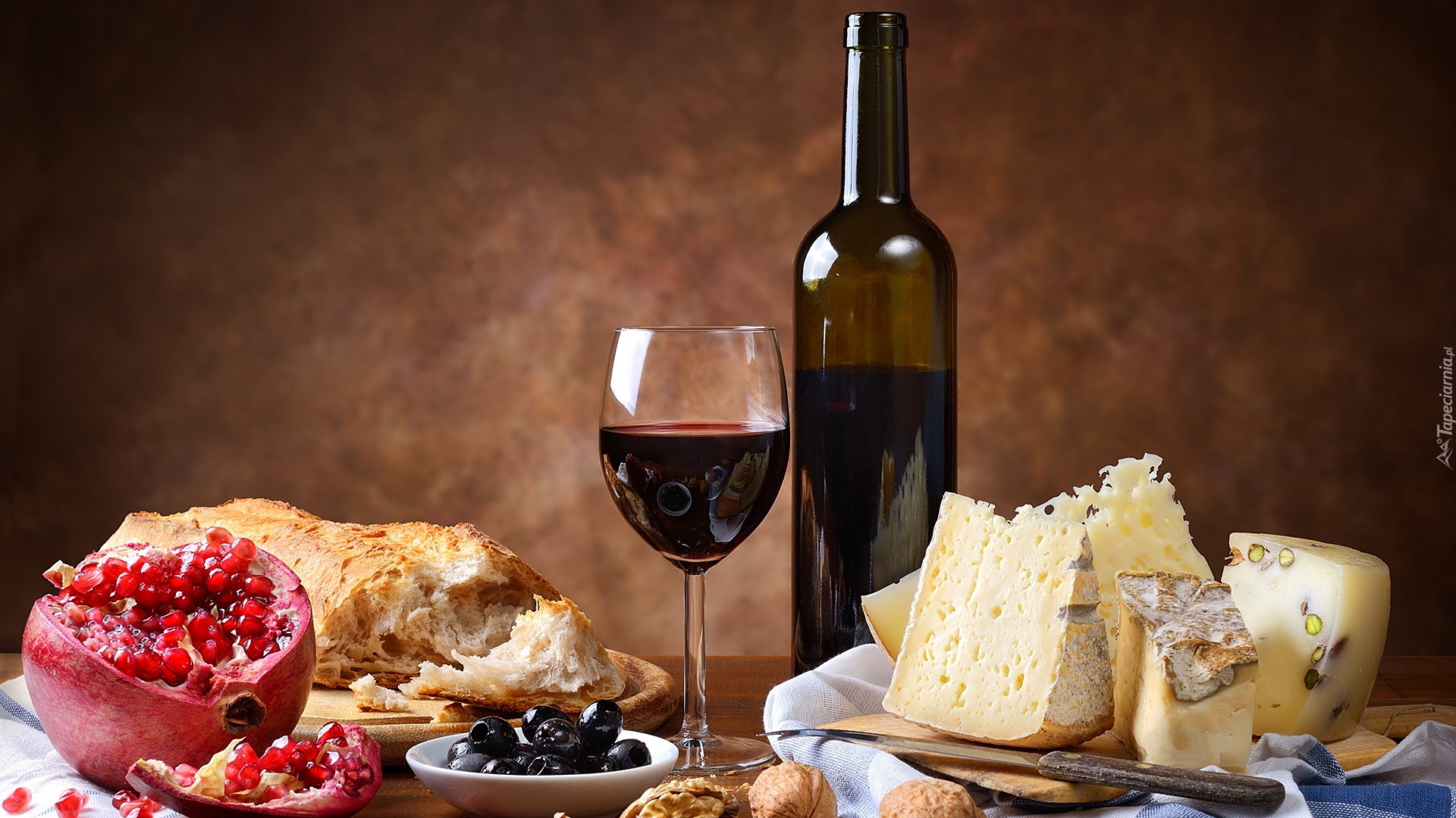 Edytor tapety: Kieliszek wina obok sera i pieczywa