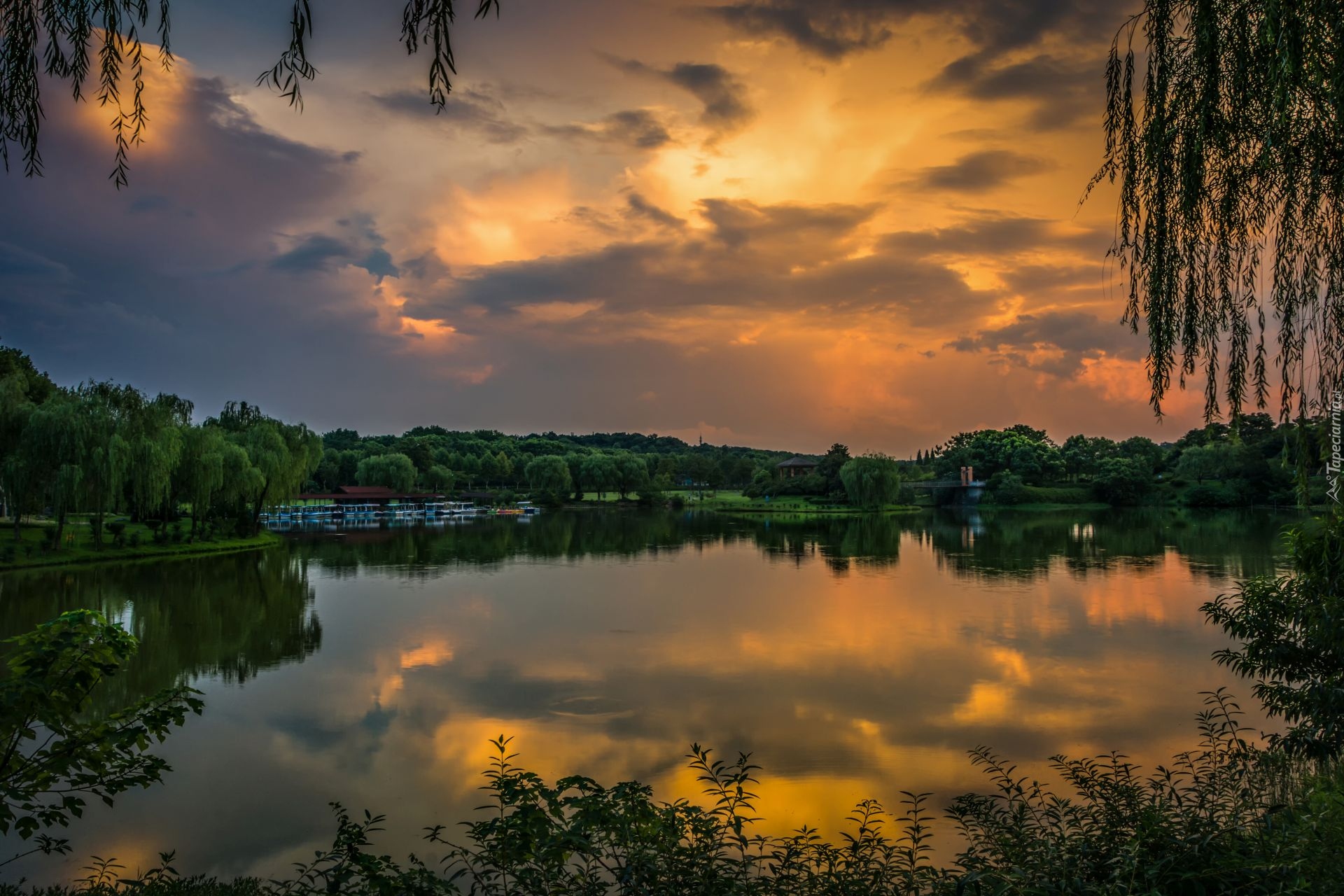 Edytor tapety: Kolorowe niebo zachodzącego słońca nad jeziorem