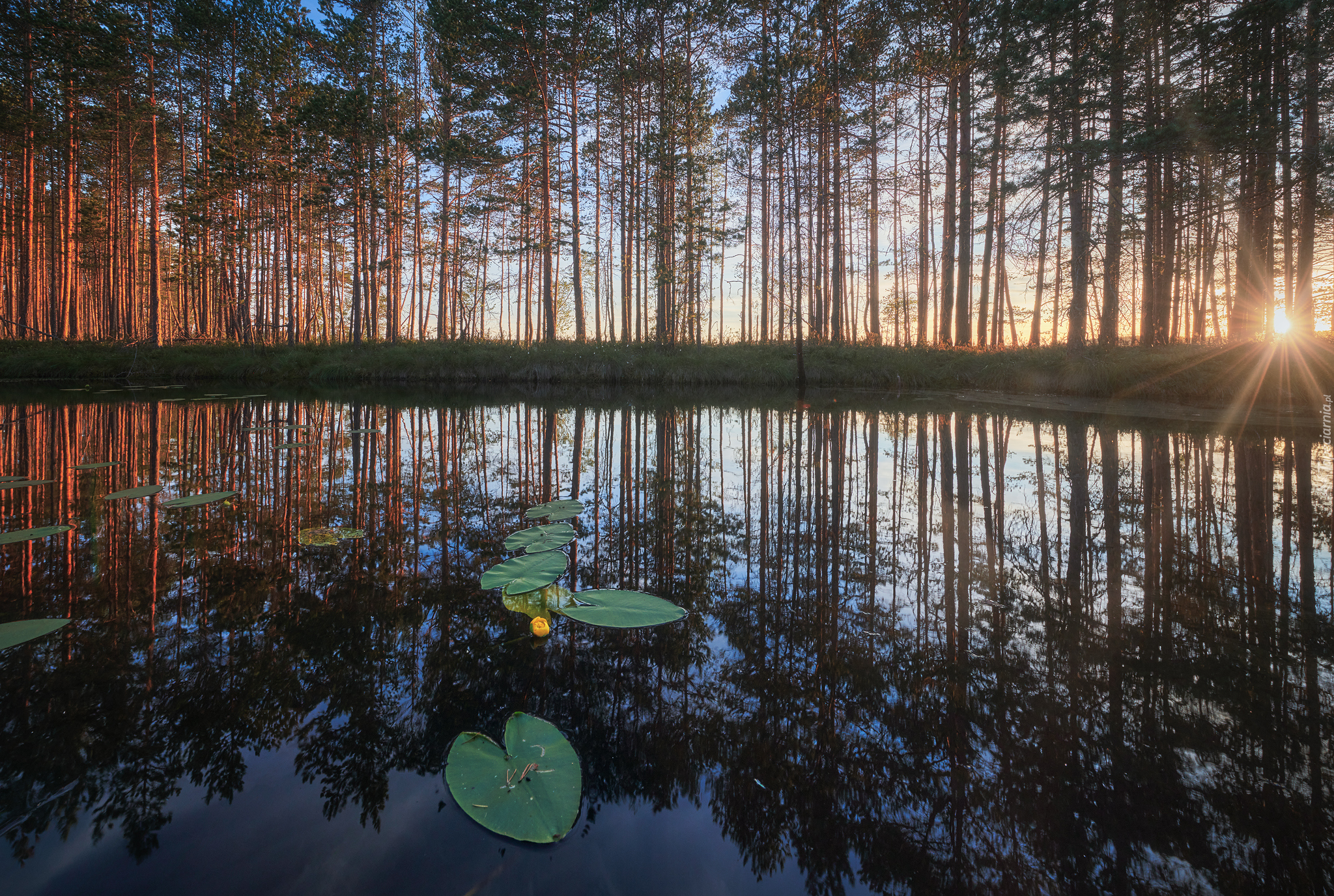 Edytor tapety: Liście lilii wodnych w stawie otoczonym drzewami