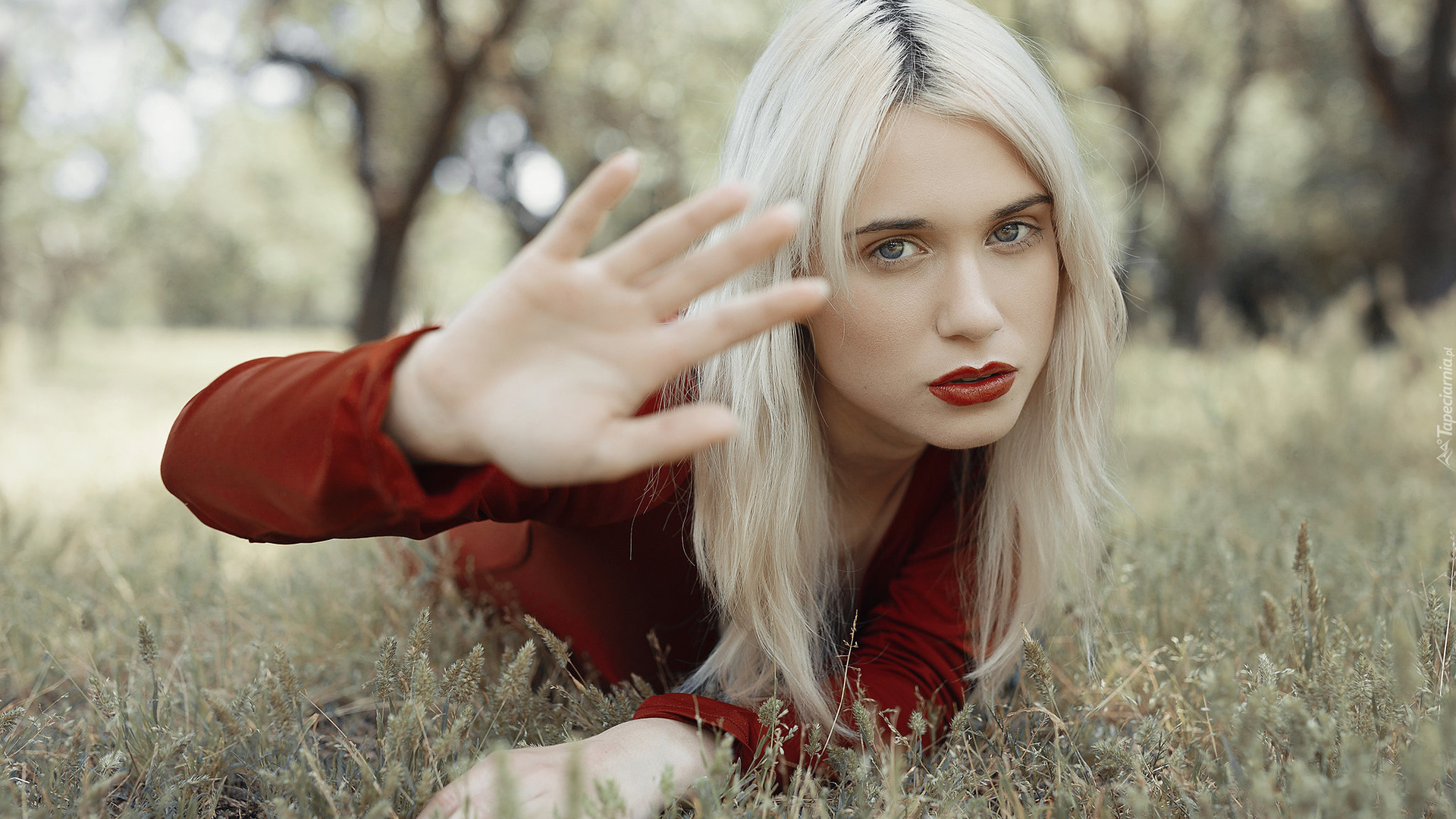Edytor tapety: Blondynka leżąca na trawie