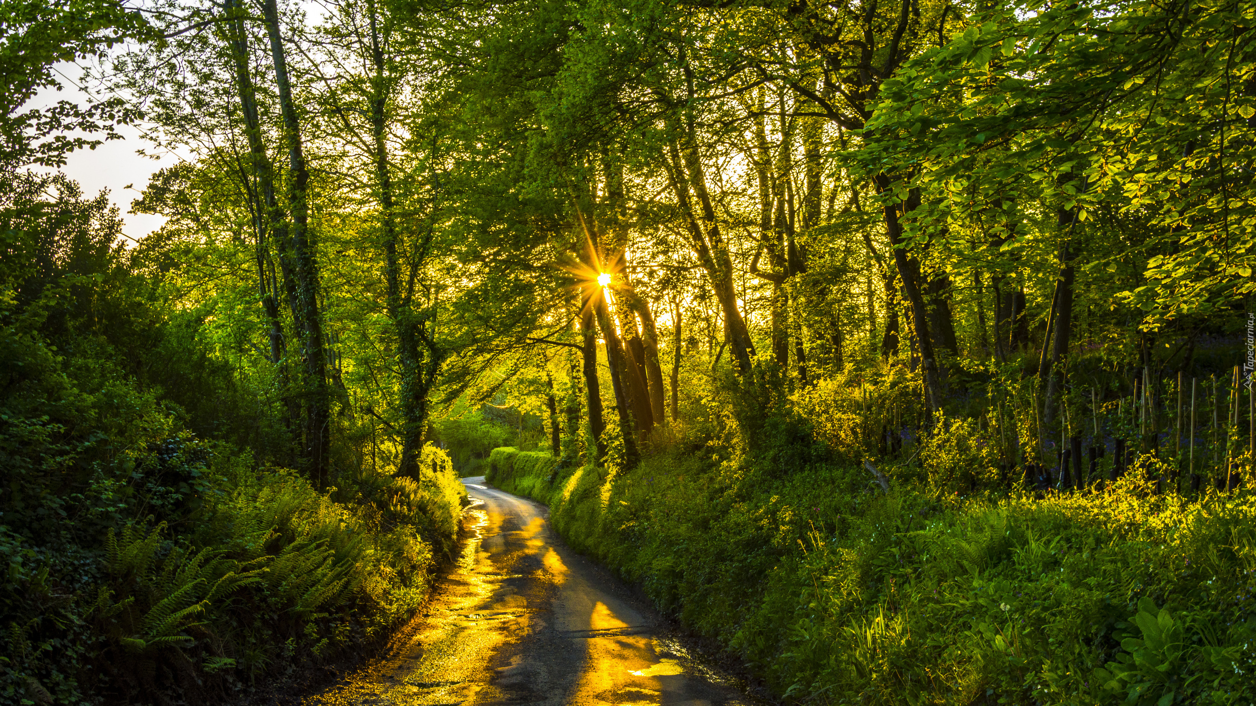 Edytor tapety: Droga wśród zielonych drzew w promieniach słońca