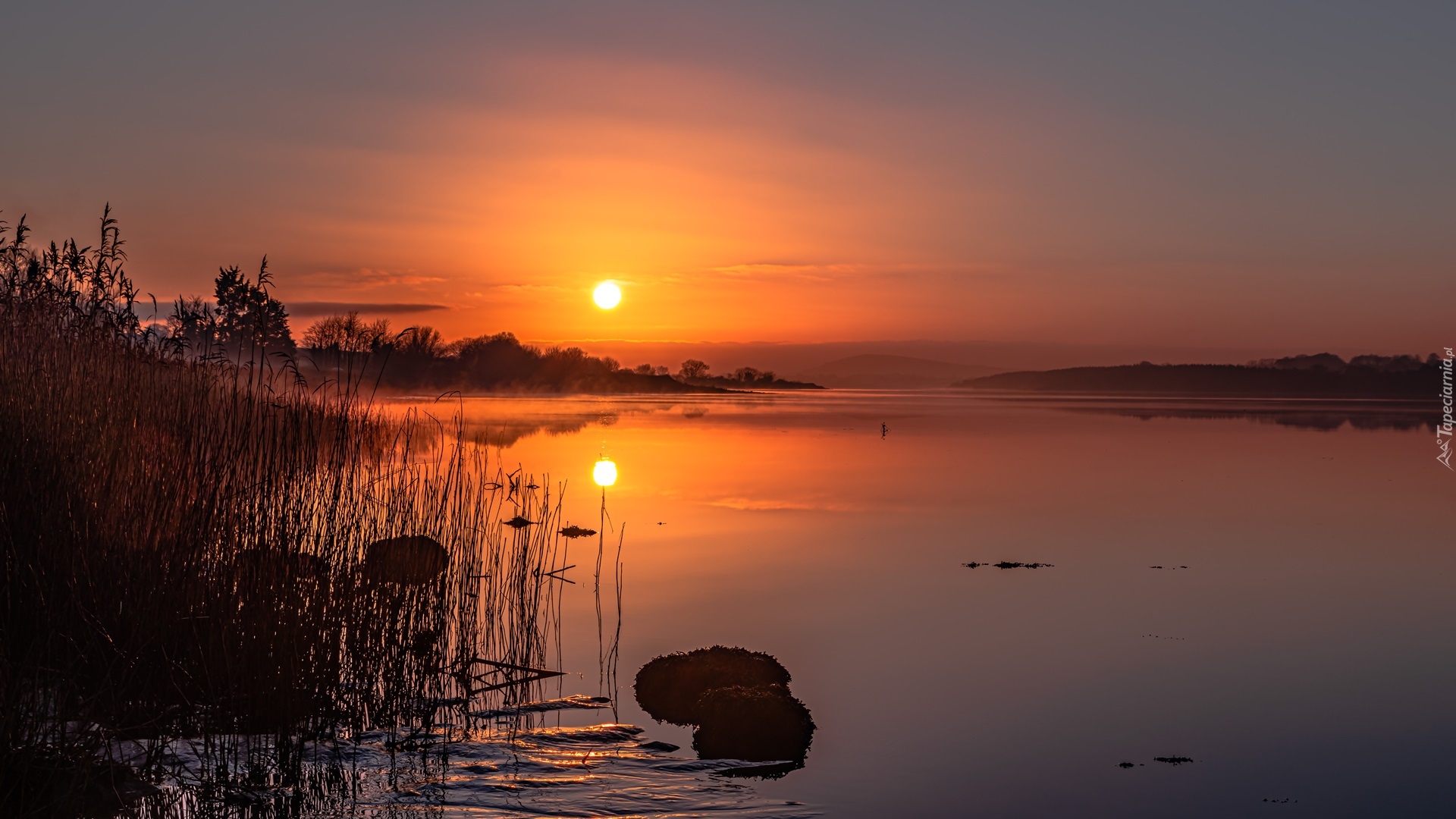 Edytor tapety: Pomarańczowy zachód słońca nad jeziorem
