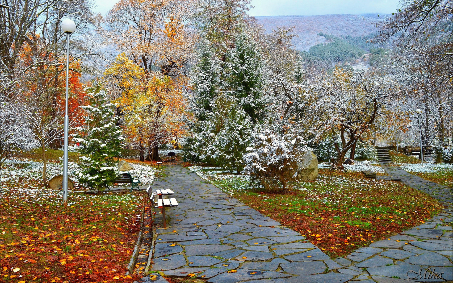 Edytor tapety: Pierwszy śnieg na jesiennych drzewach w parku