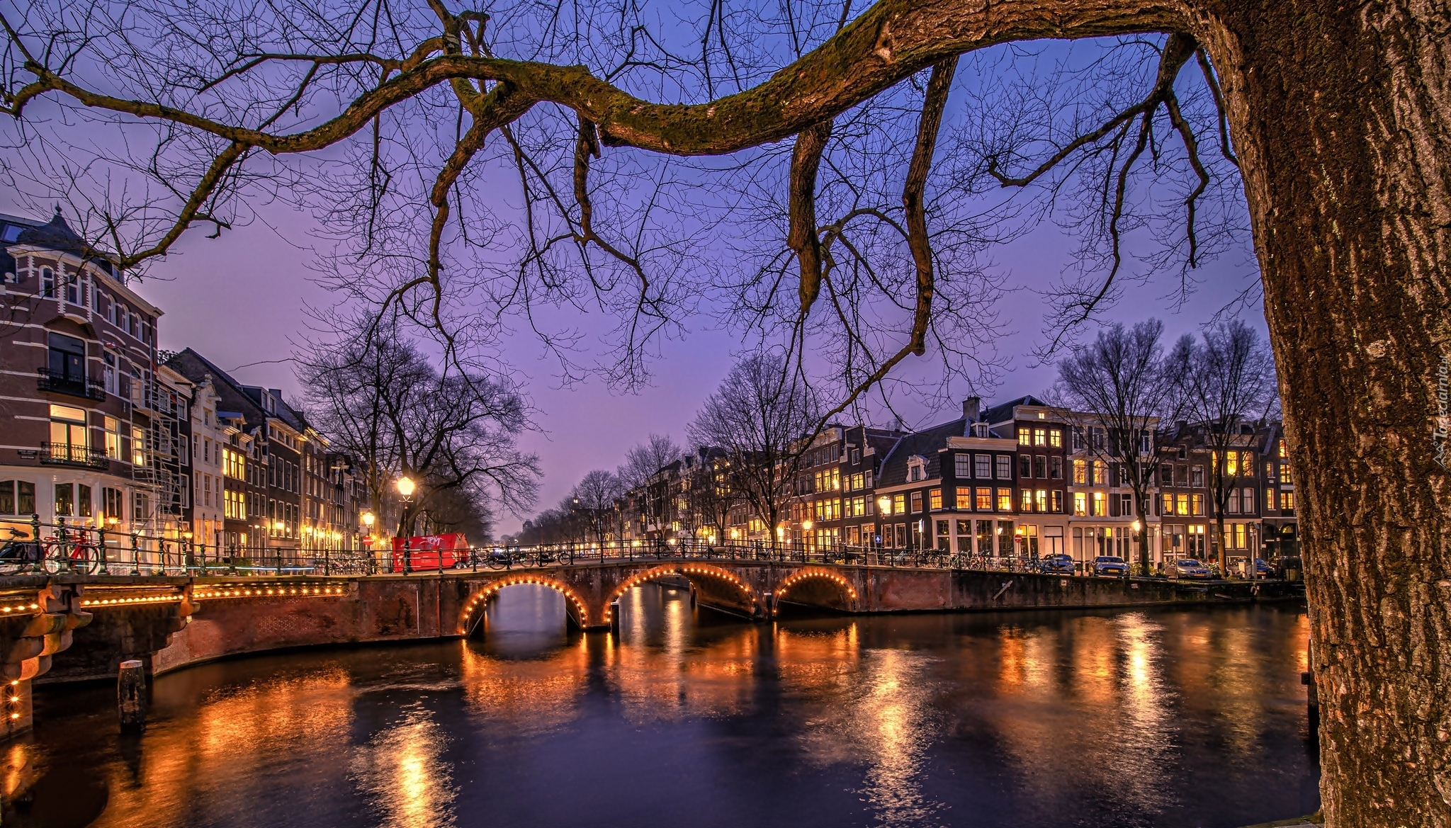 Edytor tapety: Oświetlone domy i most nad kanałem w Amsterdamie