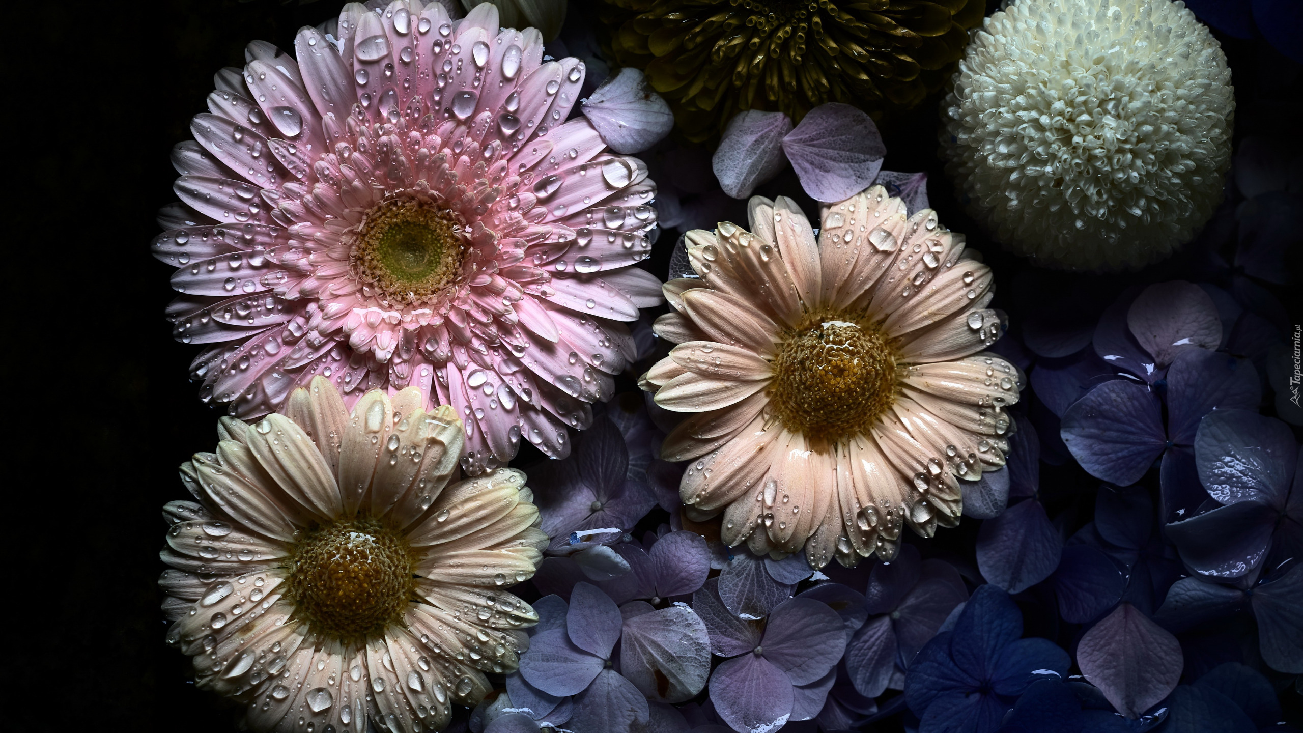 Edytor tapety: Krople wody na trzech gerberach
