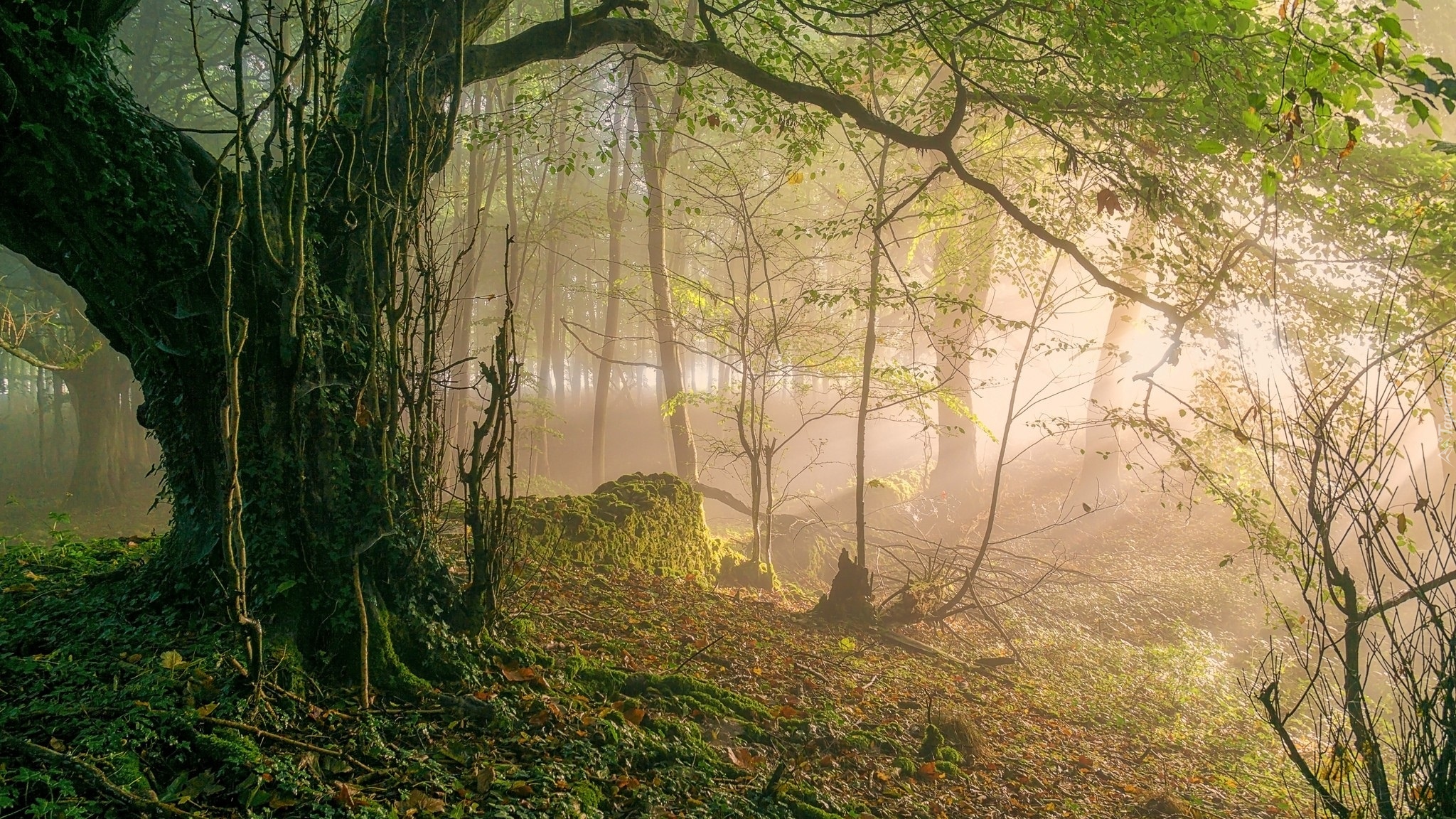 Edytor tapety: Drzewo porośnięte bluszczem w zamglonym lesie